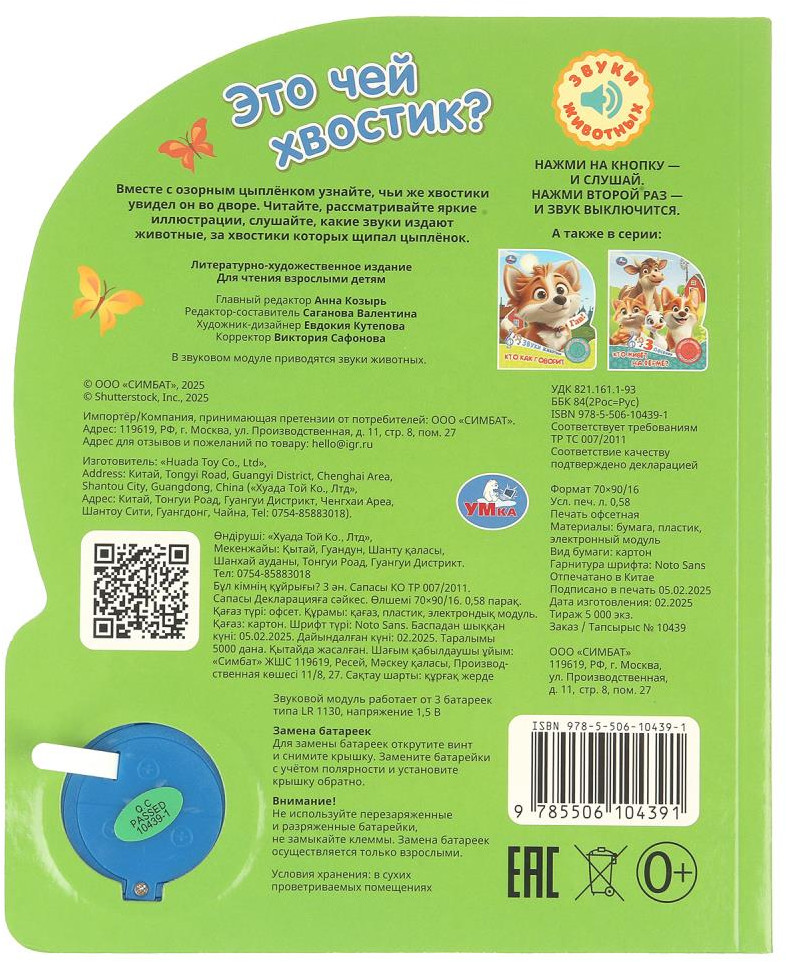 Музыкальная книга «Это чей хвостик?» ТМ «УМка» станет прекрасным подарком для малыша. Малыш с удовольствием будет листать плотные страницы, рассматривать яркие картинки и знакомиться с разными животными и их голосами. Ребёнок легко освоит включение звука: по нажатию на кнопку песенка включится, при втором нажатии выключится. Благодаря удобному формату книгу можно взять с собой в дорогу.