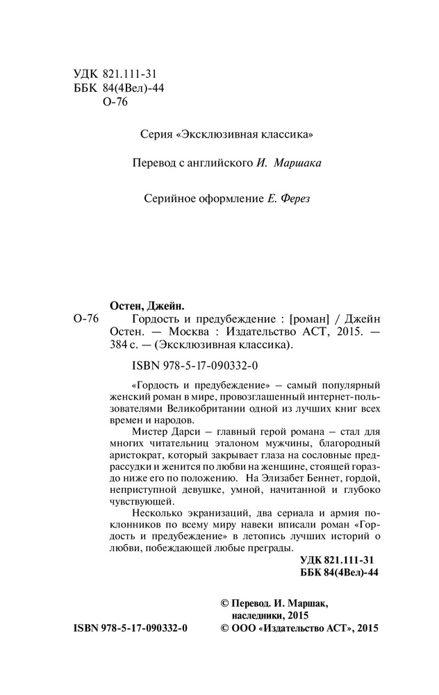 Книга пришла в отличном состояний. Страницы тверже чем многие книги «эксклюзивной классики». Это радует. Насчёт произведения ничего писать не могу, так как только что ее получила. Но я не сомневаюсь в ней. Когда то смотрела фильм «гордость и предубеждения», к счастью забыла сюжет, остались лишь воспоминания об эмоциях который получила во время просмотра.
