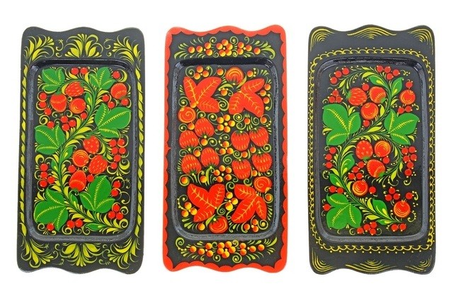 Традиционные элементы Хохломы — красные сочные ягоды рябины и земляники, цветы и ветки. Нередко встречаются птицы, рыбы и звери.