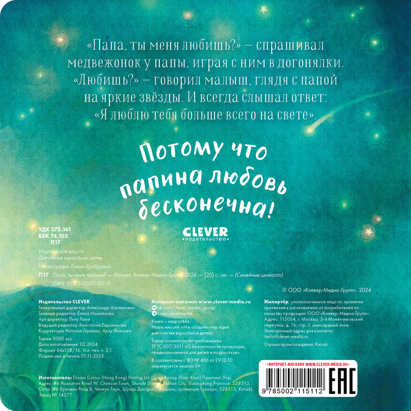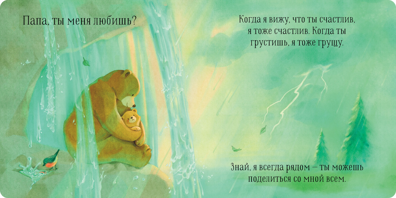 Папа, ты меня любишь?новинка В данный момент этот товар отсутствует в продаже. Возможно, у нас найдется аналогичный или похожий товар здесь. Серия: Семейные ценности «Папа, ты меня любишь?» — спрашивал медвежонок у папы, играя с ним в догонялки. «Любишь?» — говорил малыш, глядя с папой на яркие звёзды. И всегда слышал ответ: «Я люблю тебя больше всего на свете». Потому что папина любовь бесконечна! |