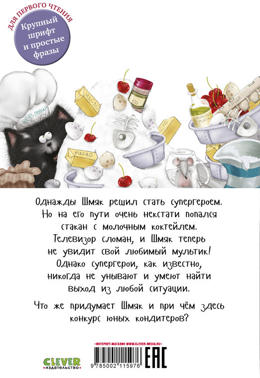 Серия: Котенок Шмяк Любимые истории про котенка Шмяка теперь и в мягкой обложке! Однажды Шмяк решил стать супергероем. Но на его пути очень некстати попался стакан с молочным коктейлем. Телевизор сломан, и Шмяк теперь не увидит свой любимый мультик! Однако супергерои, как известно, никогда не унывают и умеют найти выход из любой ситуации. Что же придумает Шмяк и при чём здесь конкурс юных кондитеров? |