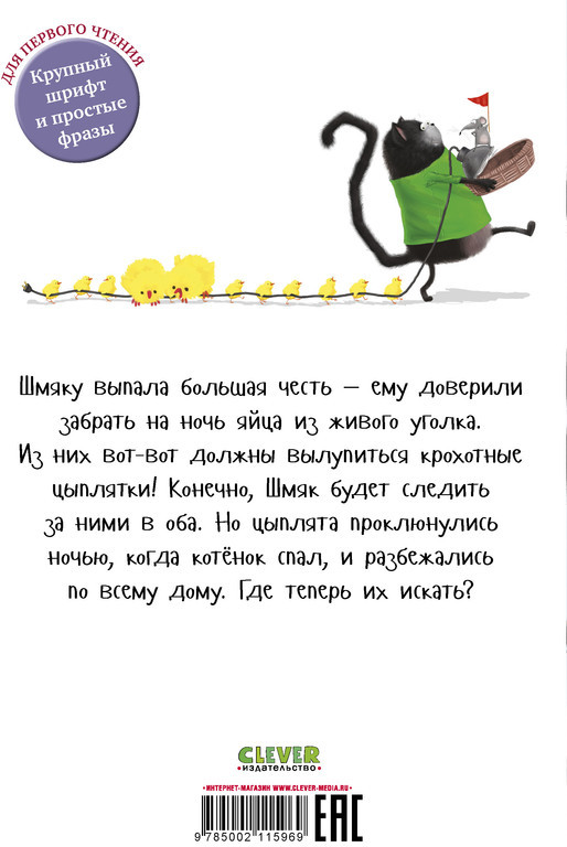 Серия: Котенок Шмяк Любимые истории про котенка Шмяка теперь и в мягкой обложке! Шмяку выпала большая честь — ему доверили забрать на ночь яйца из живого уголка. Из них вот-вот должны вылупиться крохотные цыплятки! Конечно, Шмяк будет следить за ними в оба. Но цыплята проклюнулись ночью, когда котёнок спал, и разбежались по всему дому. Где теперь их искать? |