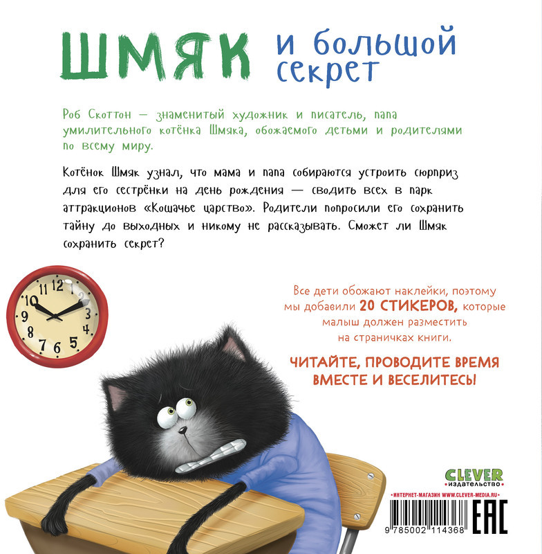Серия: Котенок Шмяк Котенок Шмяк узнал, что мама и папа собираются устроить сюрприз для его сестрёнки на день рождения — сводить всех в парк аттракционов «Кошачье царство». Родители попросили его сохранить тайну до выходных и никому не рассказывать. Сможет ли Шмяк сохранить секрет? Все дети обожают наклейки, поэтому мы добавили 20 СТИКЕРОВ, которые малыш должен разместить на страничках книги. Читайте, проводите время вместе и веселитесь! |