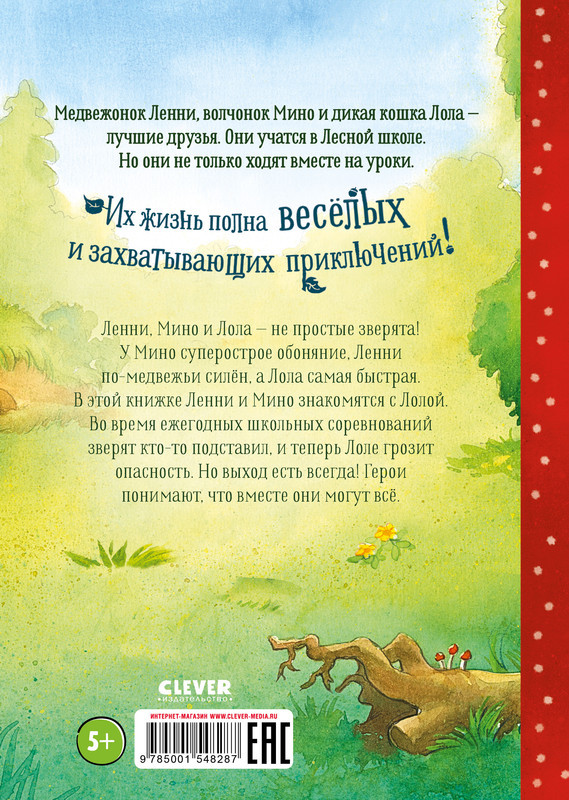 Это история о настоящей дружбе и о вере в себя. Ленни, Мино и Лола — не простые зверята! У Мино острое обоняние, Ленни по-медвежьи силён, а Лола самая быстрая. Во время ежегодных школьных соревнований зверят кто-то подставил, и теперь Лоле грозит опасность. Но выход есть всегда! Герои понимают, что вместе они могут всё. Книга в твердом переплете с цветными иллюстрациями на каждом развороте станет отличным подарком для детей. Эта книжка увлечет малышей надолго, ведь в ней целых 144 страницы! Детская книга прекрасно подойдет для чтения на ночь, ведь она разделена на главы: терпеливый читатель сможет сделать паузу и продолжить чтению на следующий день. |