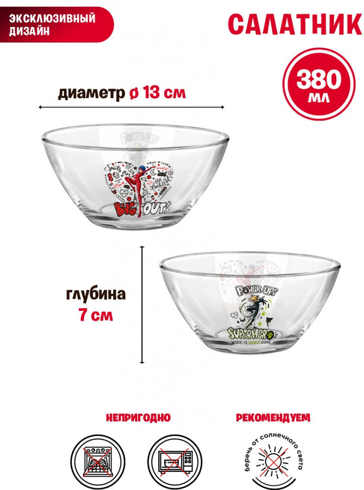Салатник «Леди Баг и Супер-Кот» — яркое и практичное дополнение к детской посуде, которое подарит радость каждому приему пищи. Выполнен из прочного стекла с красочным изображением любимых героев, он не только украсит стол, но и сделает трапезу веселее и интереснее для ребенка. Такой салатник идеально подойдет для каш, фруктов или десертов и станет отличным подарком для маленьких поклонников мультфильма.