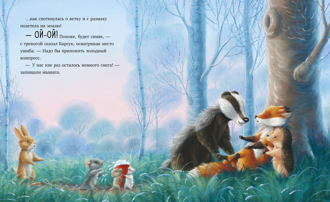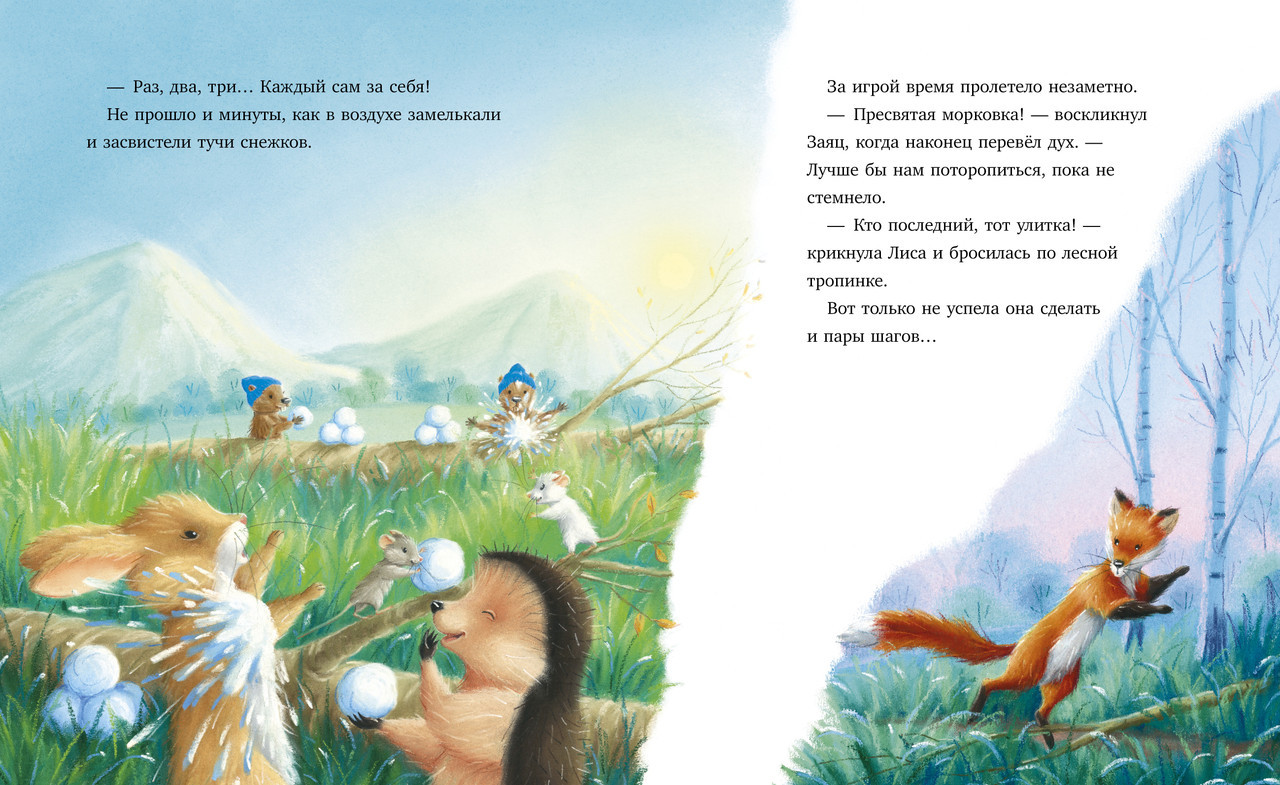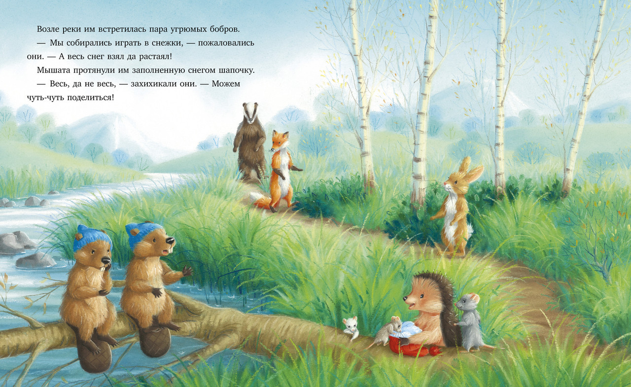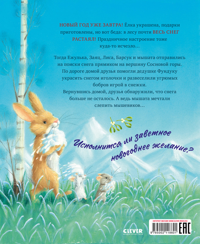 В лесу все готово к главному зимнему празднику: елка наряжена, подарки приготовлены. Одно только не радует — снег растаял, а ведь мышата так хотели слепить мышевиков! Ежулька, Заяц, Лиса, Барсук и мышата отправились на поиски снега прямиком на вершину Сосновой горы. По дороге домой друзья помогли дедушке Фундуку украсить снегом иголочки и развеселили угрюмых бобров игрой в снежки. Вернувшись домой, друзья обнаружили, что снега больше не осталось. Что же делать? Как утешить маленьких мышат?