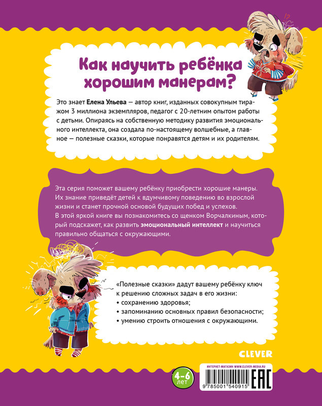 Серия: Школа хороших манер Книга «Полезные сказки. Щенок Ворчалкин» станет незаменимым помощником в воспитании. На ее страницах вы познакомитесь с задиристым щенком Ворчалкиным, который подскажет, как развить эмоциональный интеллект, понять свои и чужие эмоции. Эта серия поможет вашему ребенку приобрести хорошие манеры, которые заложат прочную основу будущих побед и успехов. Не ругайте малыша за плохое поведение! Объясните ему на доступном для него языке, как надо поступать и почему. В этом вам помогут поучительные сказки, в конце каждой из них приводится правило-помощник и предметно-ролевая игра, где моделируется схожая ситуация и ребенок закрепляет правильную модель поведения в игровой форме. |