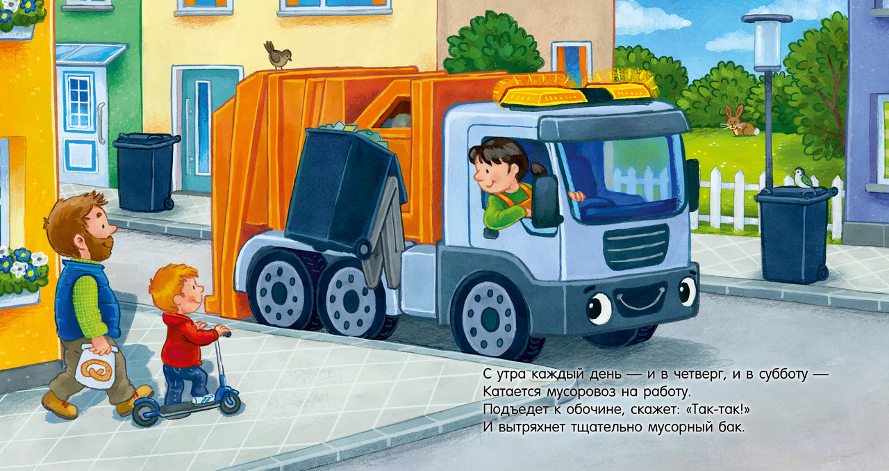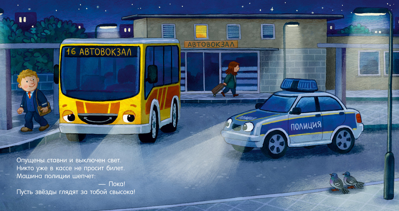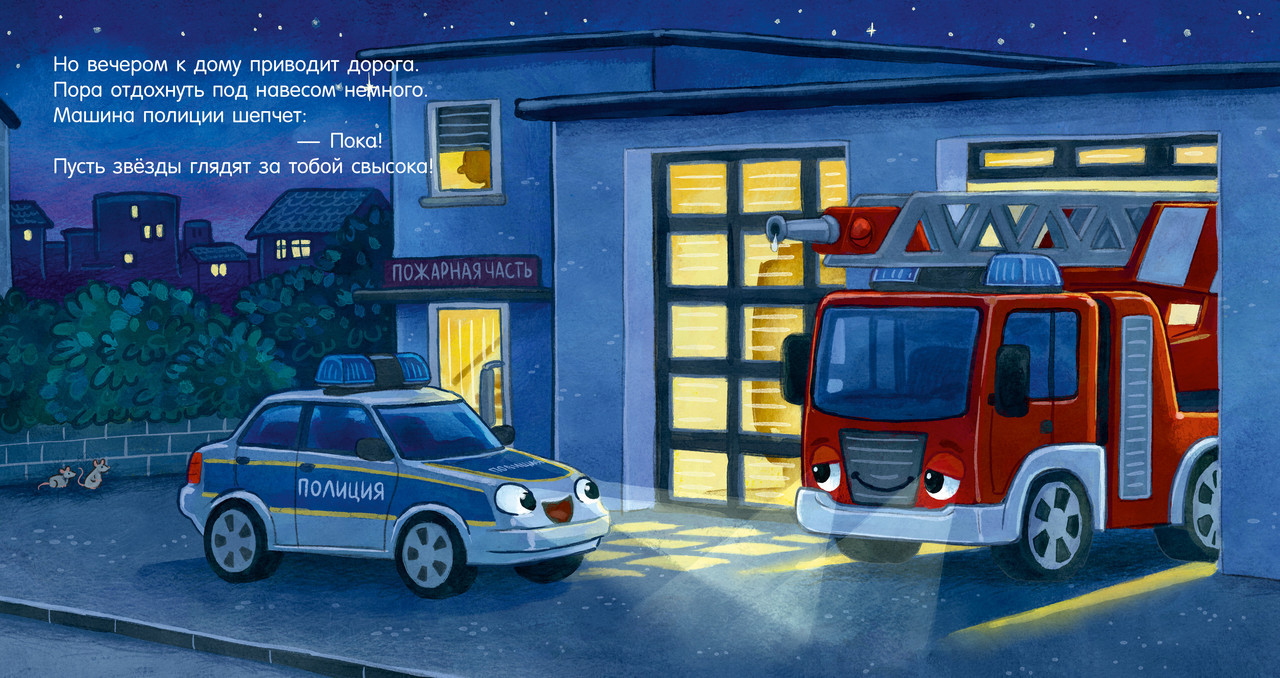 Главная героиня сказки весь день была занята — она ловила грабителей. А что делали ее любимые друзья? Пожарная машинка заливала огонь, автобус возил пассажиров по городу, мусоровоз чистил мусорные баки. А вечером все сонные машины отправляются спать, ведь приходит ночь. Полицейская машинка закрывает глазки и сладко засыпает. |