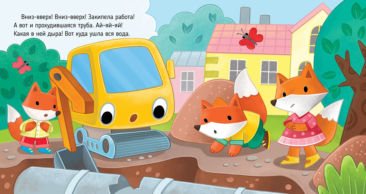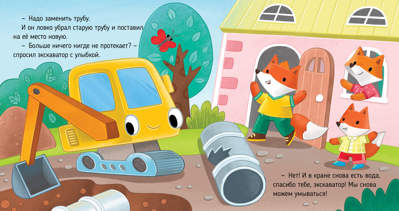 Однажды ранним утром маленькие лисята собрались умываться, но оказалось, что воды в кране нет! Испортилась труба, по которой вода поступает в дом. Что же делать? Кто поможет лисятам? Замечательная машина экскаватор! Книжку будет интересно читать дома или с друзьями в детском саду, большие яркие иллюстрации приятно рассматривать, а готовые вопросы в конце книги помогут ребятам осмыслить прочитанное.