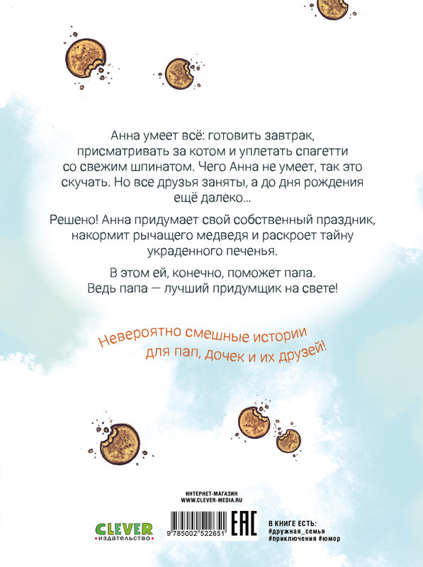 Накорми рычащего медведя. Большая книга приключений Анны и папыновинка В данный момент этот товар отсутствует в продаже. Возможно, у нас найдется аналогичный или похожий товар здесь. Серия: Clever-чтение Приключения, тайны, детективные истории, уморительно смешные диалоги, веселые картинки и очаровательные герои — все это в книге «Накорми рычащего медведя. Большая книга приключений Анны и папы». Анна не умеет скучать. Она может выдумать и отметить свой собственный праздник, накормить рычащего медведя, раскрыть тайну украденного печенья и многое другое! И во всех ее фантазиях и играх Анну поддерживает папа — лучший выдумщик на свете! |