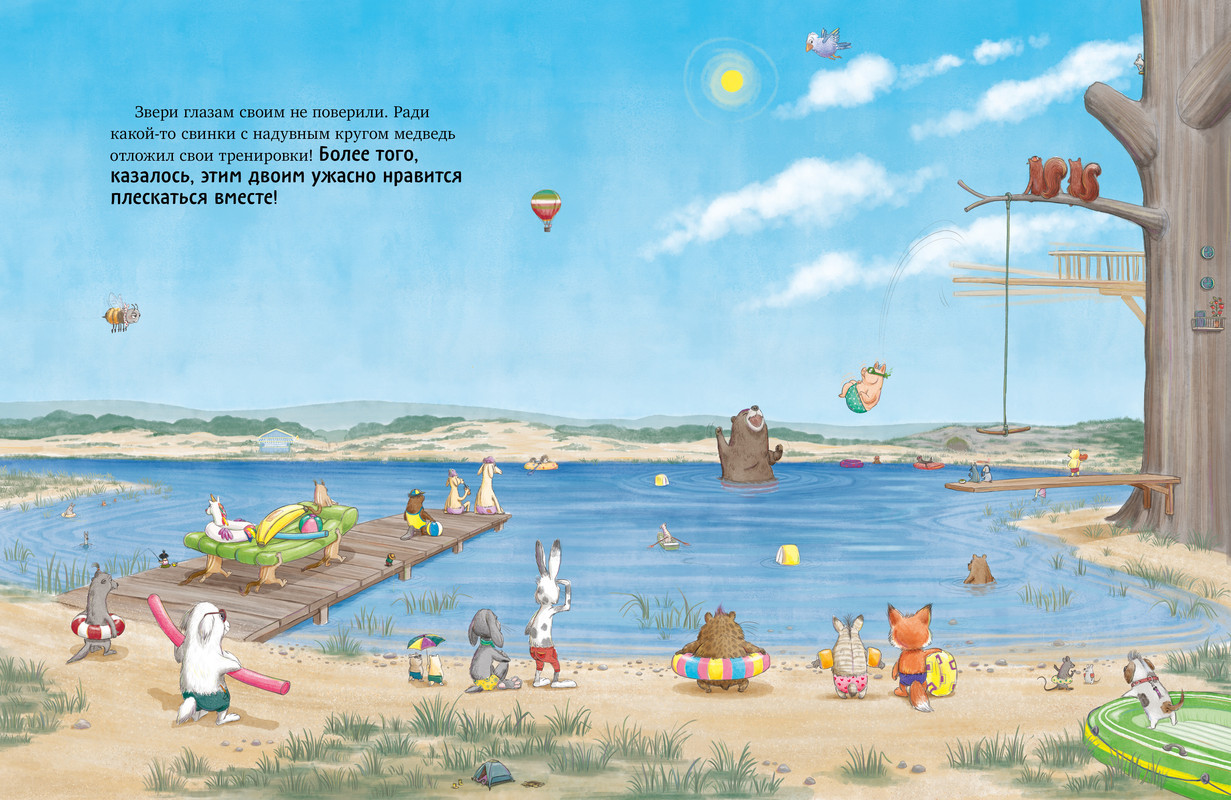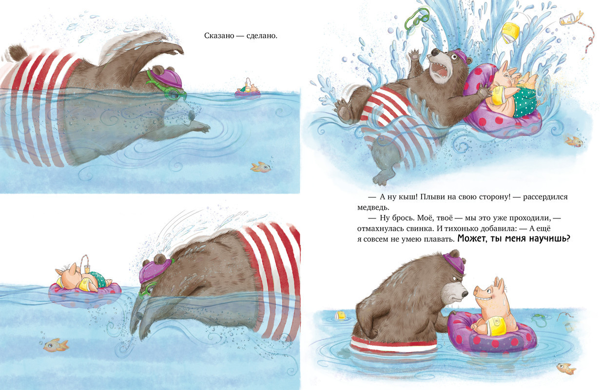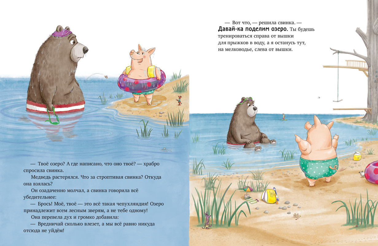 Серия: Книжки-картинки (мягкая обложка) Какой чудесный солнечный денек! Свинка решила искупаться в озере. Но, кажется, назревает ссора, ведь на озере медведь готовится к чемпионату по плаванию и никого не пускает. Уступить вредному ворчуну?Вот еще! Смелая свинка сможет договориться! Эта добрая сказка о приключениях лесных зверей, как и любая сказкотерапия, поможет в воспитании детей и позволит родителям поговорить с малышами о дружбе.
