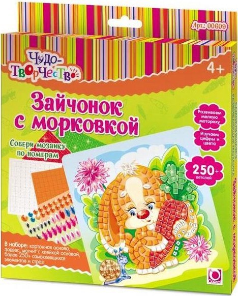 Origami Cамоклеящаяся мозаика «Зайчонок с морковкой»В данный момент этот товар отсутствует в продаже. Возможно, у нас найдется аналогичный или похожий товар здесь. Серия: Чудо Творчество Этот очаровательный зайка может поселиться в вашей комнате, если вы соберете эту чудесную мозаику! Она разработана специально для малышей — поля на рисунке и клейкие квадратики имеют нумерацию, следуя которой нужно приклеивать элемент с определенной цифрой на поле с именно такой же цифрой. Определенные фоновые элементы и детали мордочки декорируются блестящими стразами, входящими в комплект. Постепенно, шаг за шагом, вы увидите, как белый лист превращается в великолепную картину! Ее можно повесить на стену или дверцу холодильника. |
