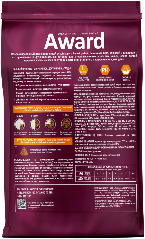 Award Корм для стерилизованных кошек с белой рыбой «Sterilized»