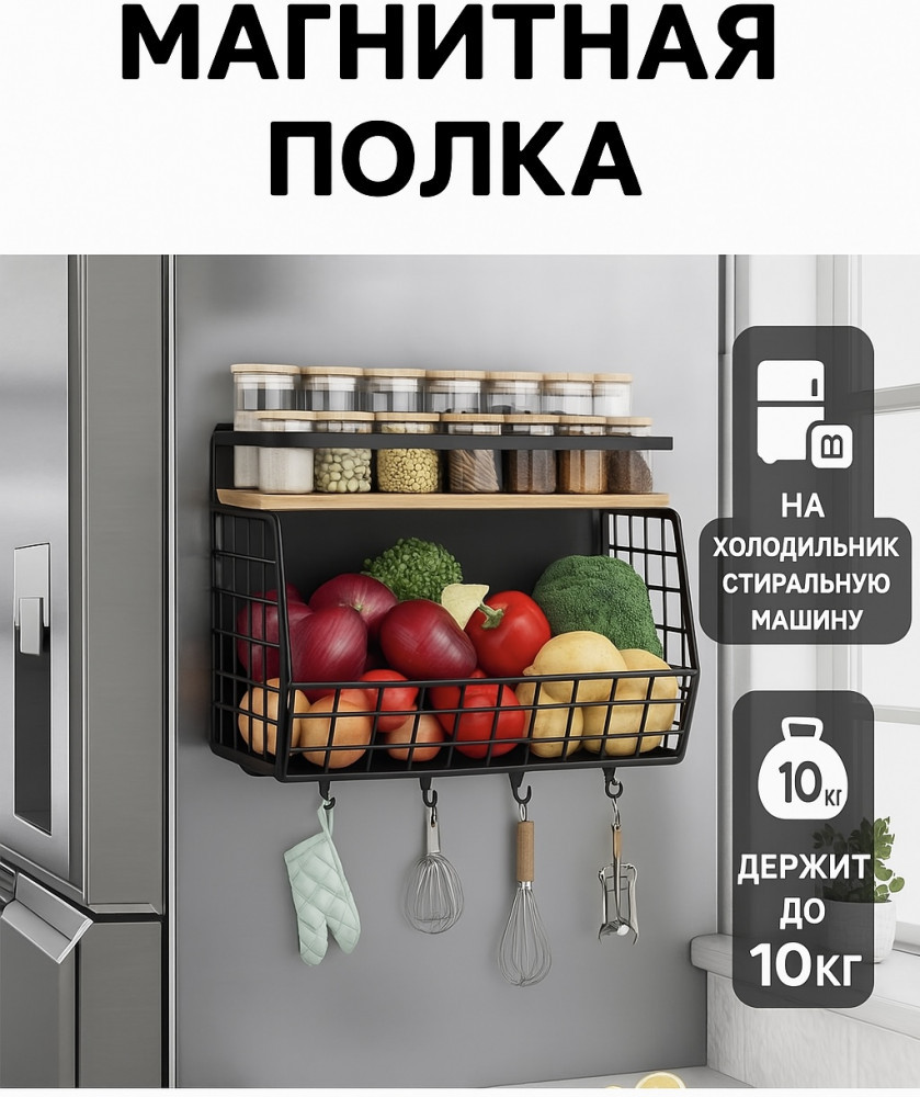 Магнитный органайзер – порядок и удобство на вашей кухне! Идеальное решение для хранения специй, овощей, кухонных аксессуаров и полотенец – без сверления и клея! Двухуровневая магнитная полка надежно крепится к холодильнику или любой металлической поверхности, освобождая пространство и создавая уют. |