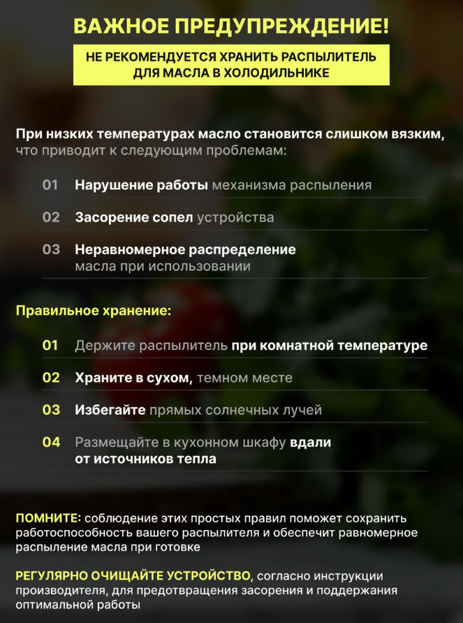 💳 Оплатить за товар можно при получении 🇰🇿 Есть бесплатная доставка по Казахстану 🎁 Копите бонусы с каждой покупки Ваша кухня заслуживает только лучших аксессуаров! Представляем вам эстетичный и функциональный распылитель для масла. Этот гаджет станет незаменимым помощником в приготовлении блюд, позволяя равномерно распылить масло на сковороду или салат. Благодаря удобному дозатору, вы сможете контролировать количество масла, не переливая его. Это не только удобно, но и экономично! Бутылка для масла с распылителем выполнена из стекла, что делает ее прочной и долговечной. Эта емкость для масла растительного подойдет для любой кухни, добавляя стиль и удобство в использовании. Стеклянная посуда никогда не была такой функциональной! Пульверизатор для масла — это не просто кухонная утварь, это настоящий помощник на кухне. Не откладывайте покупку этого приспособления на потом — сделайте свою кухню еще уютнее и функциональнее прямо сейчас! |