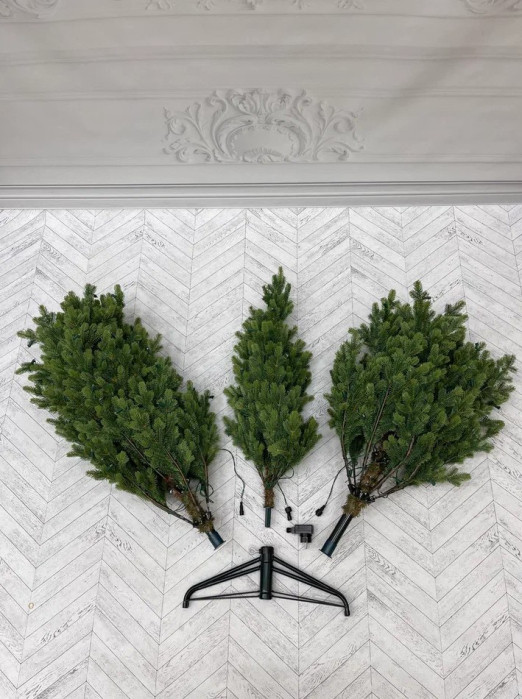 Модель представлена в ростовках от 155 см до 230 см. Ель состоит из верхушки, сборного каркасного ствола и устойчивой металлической подставки. Крепление веток на елку — на шарнирах. Еловые иголочки не осыпаются, не мнутся и не выцветают со временем. Полимерные материалы, из которых они изготовлены, нетоксичны, не пахнут и имеют высокую степень пожаробезопасности EN 71-2.