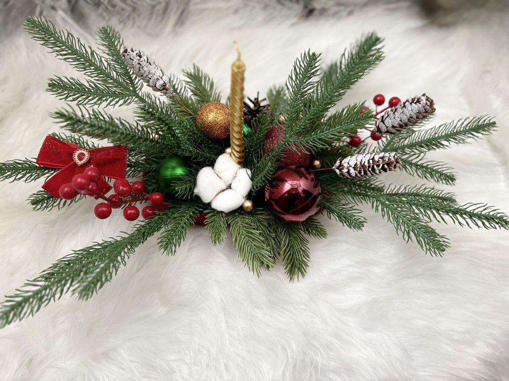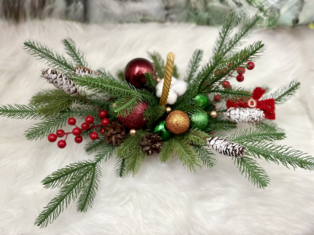 В данный момент этот товар отсутствует в продаже. Возможно, у нас найдется аналогичный или похожий товар здесь. Создайте волшебную атмосферу праздника в доме! Элегантная новогодняя композиция ручной работы из качественной искусственной хвои украсит ваш праздничный стол, каминную полку или станет тёплым подарком для близких. Каждая деталь подобрана с любовью: натуральные шишки со снежным декором, яркие елочные шары, ягодные веточки и изящные банты — всё гармонично сочетается, создавая праздничное настроение.