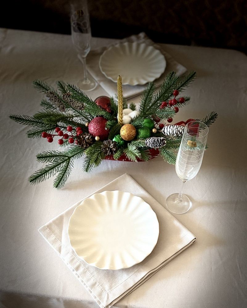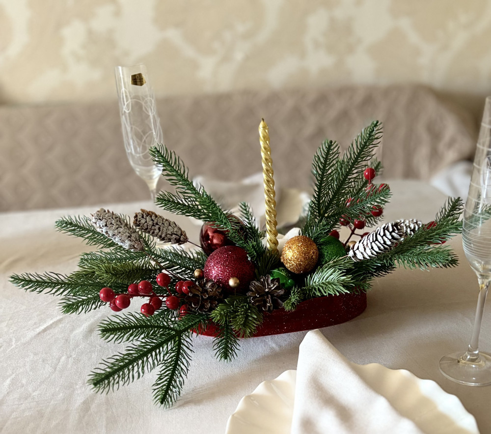 В центре композиции — декоративная свеча, которая добавляет уюта и делает декор стильным акцентом праздничного стола.