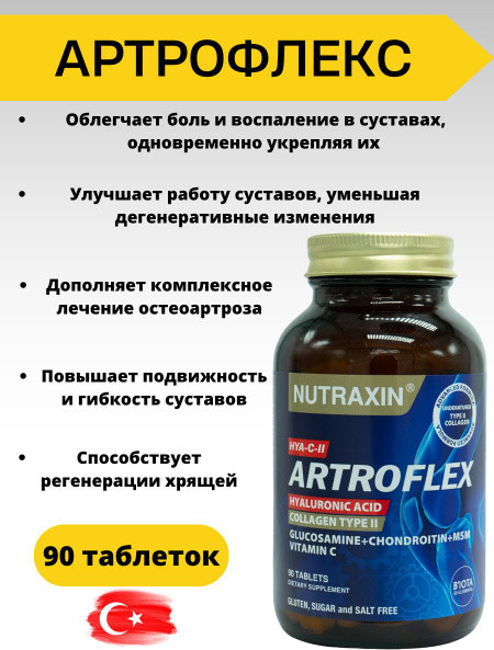 Nutraxin Artroflex HUA-C-II — это xондропротекторный комплекс, применяемый при заболеваниях суставов, при повышенных физических нагрузках и для профилактики артритов и артрозов. Благоприятно воздействует на суставы, хрящи и костные ткани. Содержит 6 активных ингредиентов: глюкозамин, хондроитин, МСМ, витамин С, гиалуроновую кислоту и коллаген 2 типа. Имеет международные сертификаты GMP и HACCP.