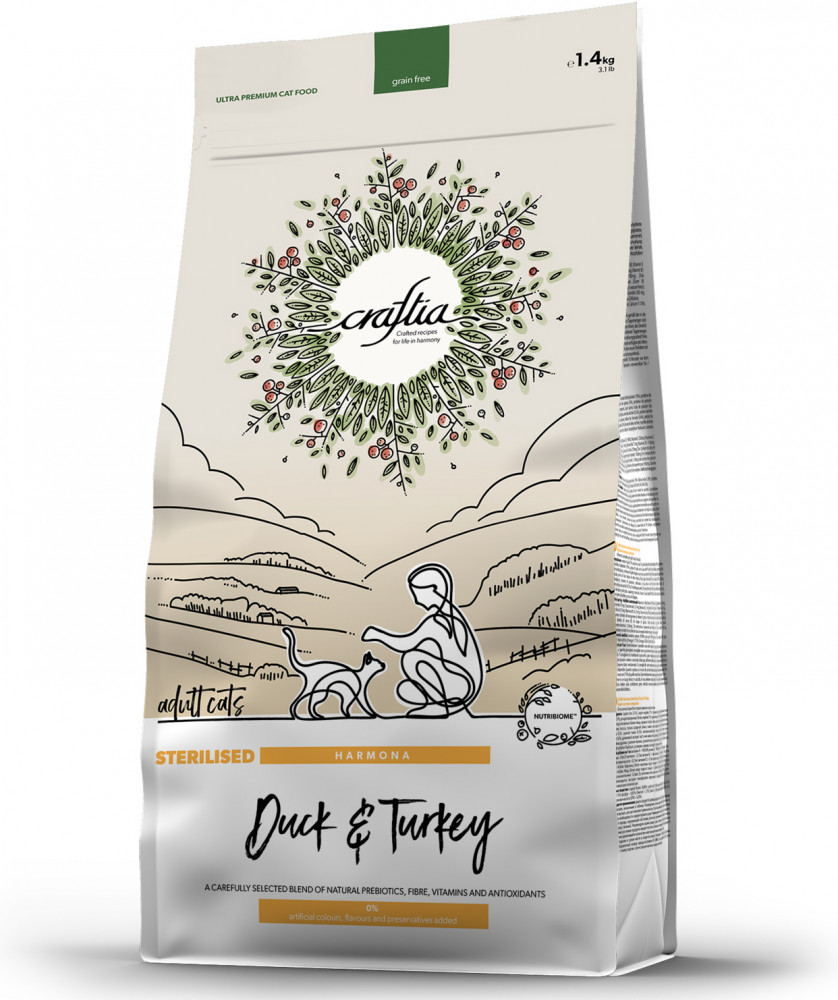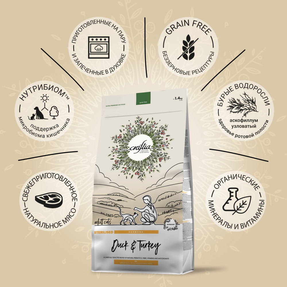 Craftia Harmona — корм для кошек ультрапремиум класса, созданный с любовью к природе. Состав кормов Craftia прозрачен и понятен, отсутствуют скрытые добавки и сомнительные ингредиенты. Все, что заявлено в составе корма, гарантированно присутствует в каждой грануле. Собственный завод, сотни квадратных метров научно-исследовательских лабораторий, первоклассное сырье — все это позволяет создавать тщательно сбалансированный высокобелковый корм с холистическим подходом. Все компоненты корма подходят для употребления человеком и не содержат ГМО.