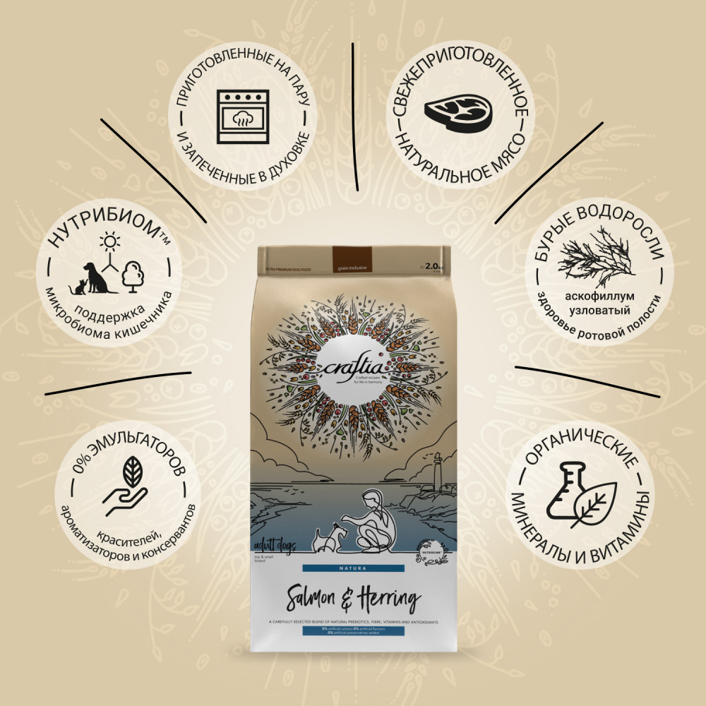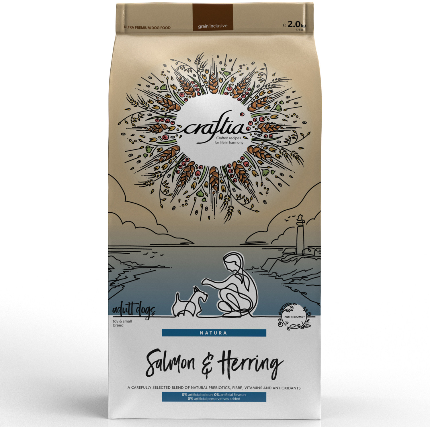 Корм для взрослых собак миниатюрных и мелких пород из лосося с сельдью «Natura» | Craftia