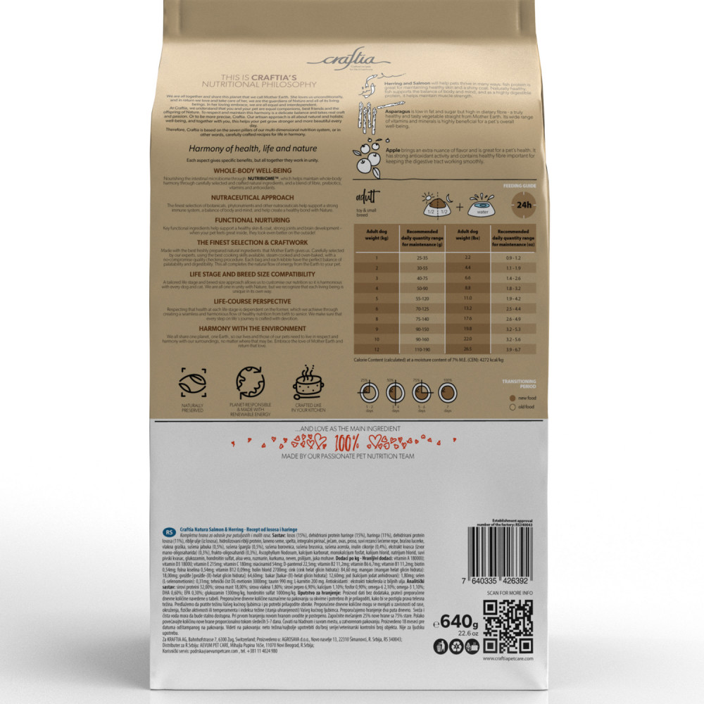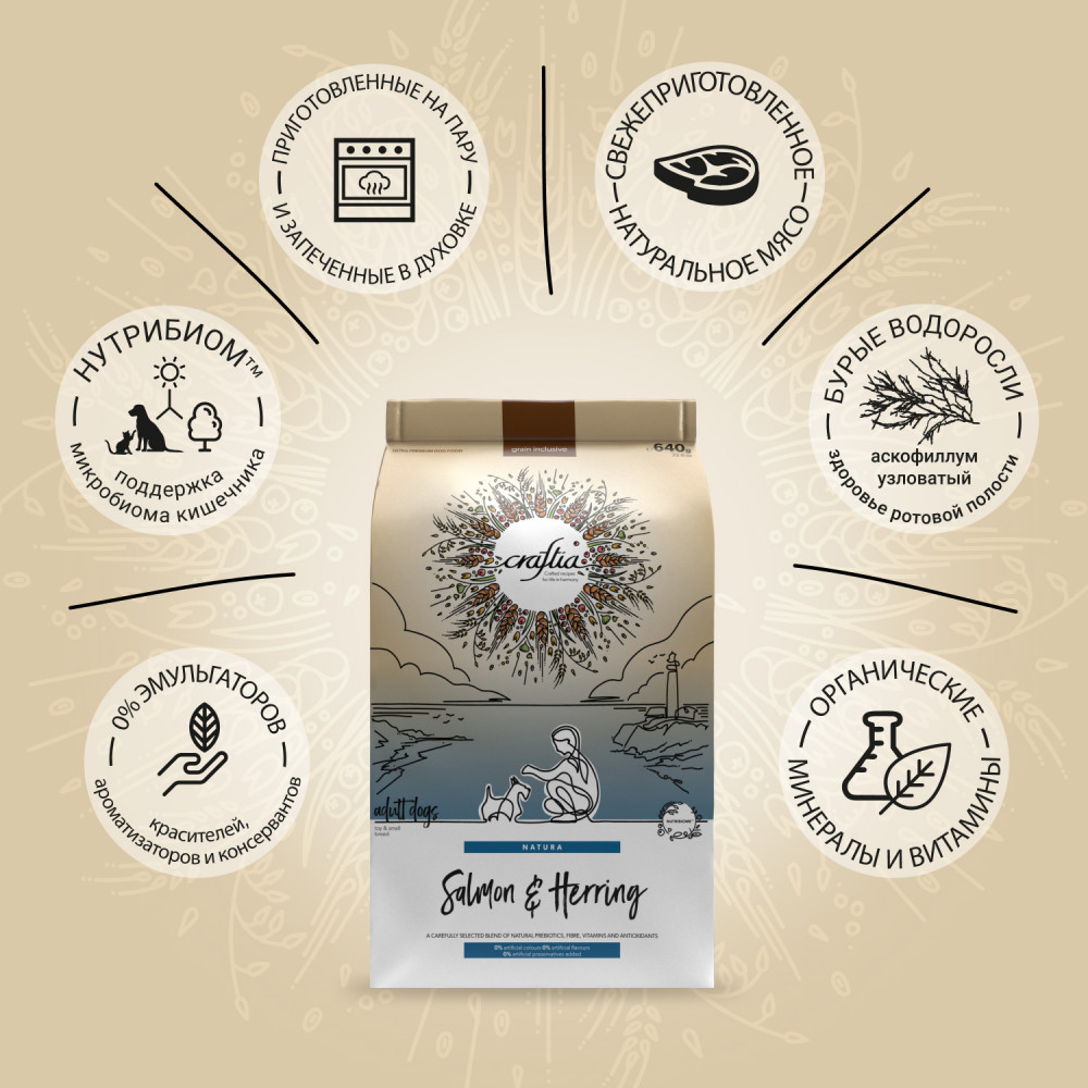 Craftia Natura — корм для собак ультрапремиум класса, созданный с любовью к природе. Состав кормов Craftia прозрачен и понятен, отсутствуют скрытые добавки и сомнительные ингредиенты. Все, что заявлено в составе корма, гарантированно присутствует в каждой грануле. Собственный завод, сотни квадратных метров научно-исследовательских лабораторий, первоклассное сырье — все это позволяет создавать тщательно сбалансированный высокобелковый корм с холистическим подходом. Все компоненты корма подходят для употребления человеком и не содержат ГМО.