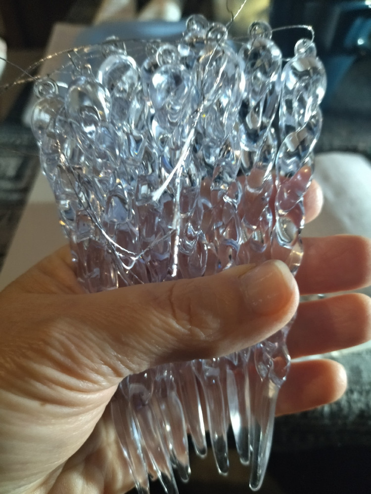 Сами сосульки легкие, в набор мне положили сосульки и ниточки. Вот ниточки очень тонкие, мы их еле привязали к сосулькам если честно. Так неплохие, по прочности еще не тестировали