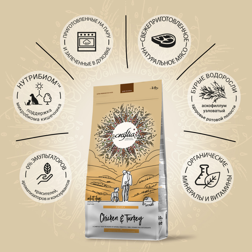 Craftia Корм для взрослых собак средних и крупных пород из курицы и индейки «Natura»