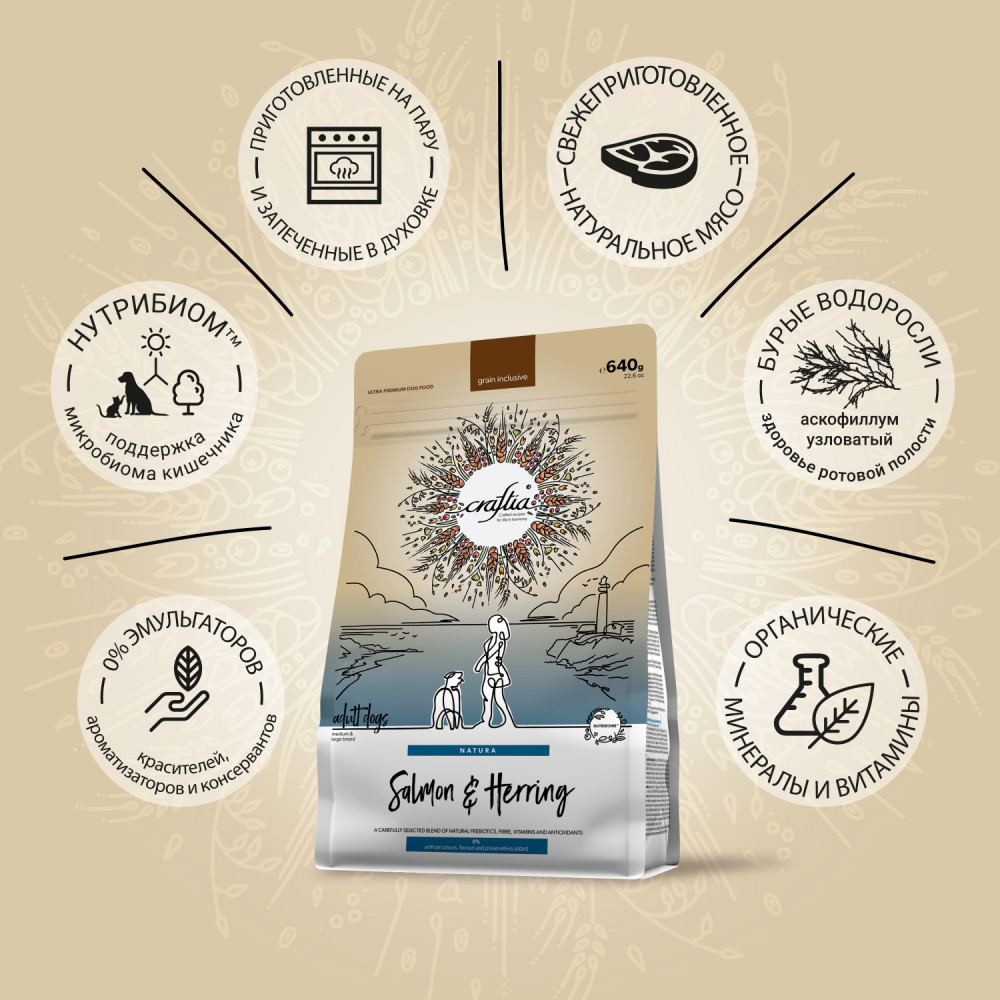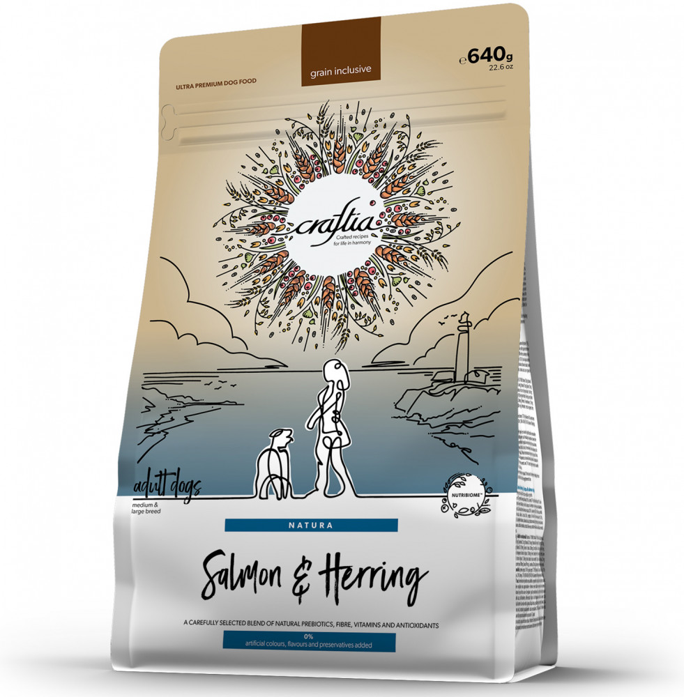 Craftia Natura — корм для собак ультрапремиум класса, созданный с любовью к природе. Состав кормов Craftia прозрачен и понятен, отсутствуют скрытые добавки и сомнительные ингредиенты. Все, что заявлено в составе корма, гарантированно присутствует в каждой грануле. Собственный завод, сотни квадратных метров научно-исследовательских лабораторий, первоклассное сырье — все это позволяет создавать тщательно сбалансированный высокобелковый корм с холистическим подходом. Все компоненты корма подходят для употребления человеком и не содержат ГМО.