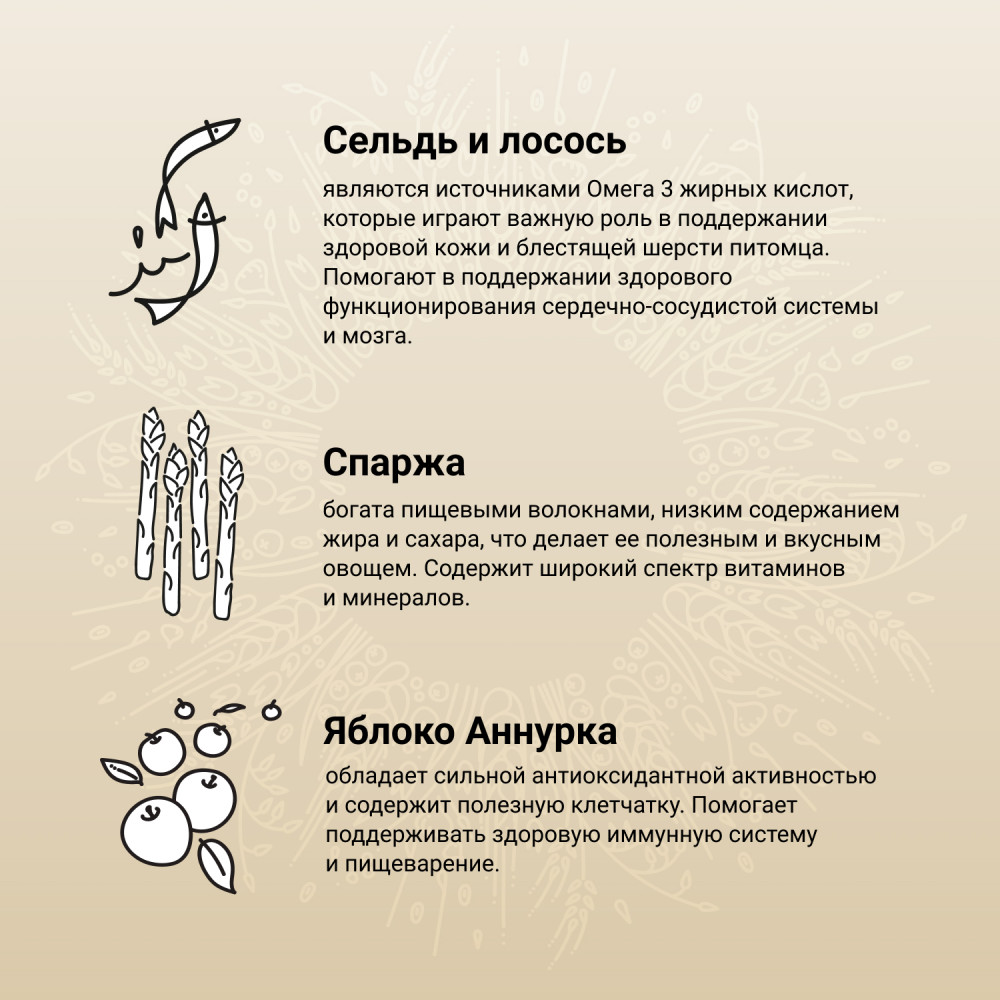 Основные источники белка в корме — лосось и сельдь. Они богаты незаменимыми Омега-3 жирными кислотами и минеральными веществами. Жирные кислоты контролируют воспалительные процессы в организме, что хорошо влияет на здоровье суставов. Легкоусвояемый рыбный белок способствует формированию крепкой мускулатуры, улучшает состояние кожи. Источники углеводов — спельта, бурый рис, ячмень, овес и просо. Специально подобраны злаки с разным гликемическим индексом, чтобы питомец дольше чувствовал себя сытым: глюкоза поступает в организм постепенно, а значит, чувство голода не наступает дольше. Источники клетчатки — свекольная пульпа, волокна гороха и люцерновая мука.