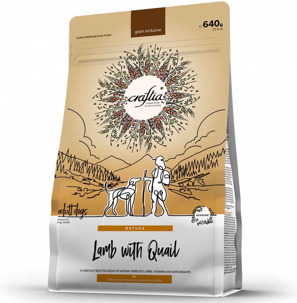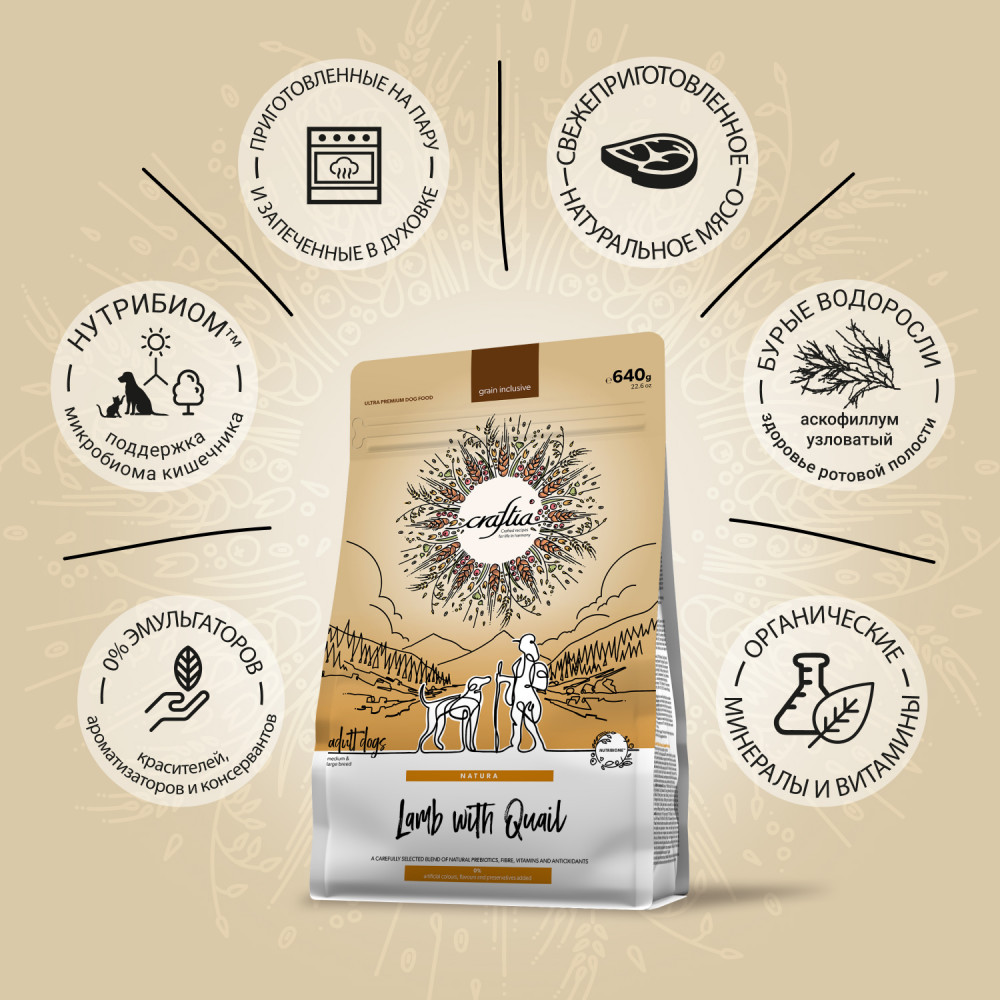 Craftia Natura — корм для собак ультрапремиум класса, созданный с любовью к природе. Состав кормов Craftia прозрачен и понятен, отсутствуют скрытые добавки и сомнительные ингредиенты. Все, что заявлено в составе корма, гарантированно присутствует в каждой грануле. Собственный завод, сотни квадратных метров научно-исследовательских лабораторий, первоклассное сырье — все это позволяет создавать тщательно сбалансированный высокобелковый корм с холистическим подходом. Все компоненты корма подходят для употребления человеком и не содержат ГМО.