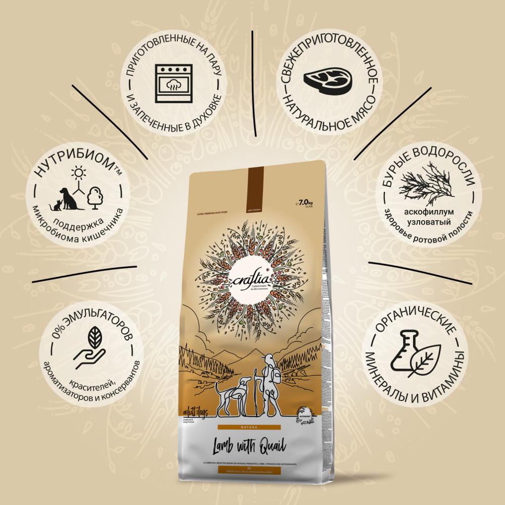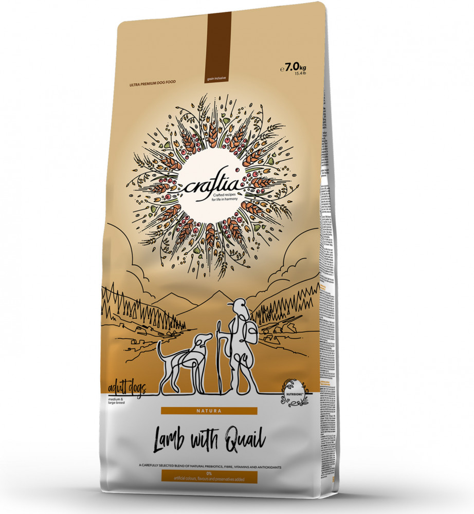 Craftia Natura — корм для собак ультрапремиум класса, созданный с любовью к природе. Состав кормов Craftia прозрачен и понятен, отсутствуют скрытые добавки и сомнительные ингредиенты. Все, что заявлено в составе корма, гарантированно присутствует в каждой грануле. Собственный завод, сотни квадратных метров научно-исследовательских лабораторий, первоклассное сырье — все это позволяет создавать тщательно сбалансированный высокобелковый корм с холистическим подходом. Все компоненты корма подходят для употребления человеком и не содержат ГМО.