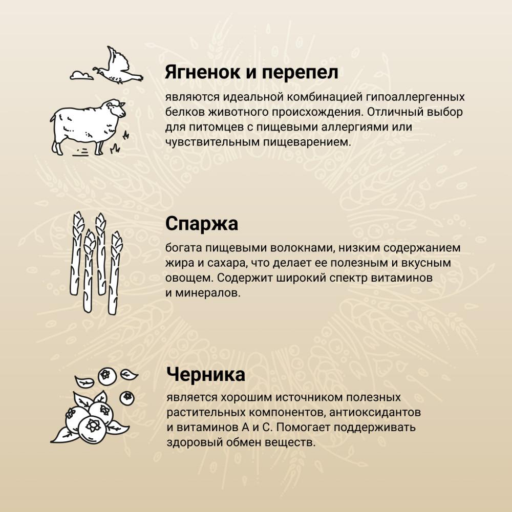 Основные источники белка в корме — свежее мясо ягненка и перепелки. Это редко встречающиеся источники белка, поэтому они подходят животным, склонным к возникновению аллергических реакций. Ягненок и перепелка — отличные источники незаменимых аминокислот, витаминов и минералов. Они легко усваиваются, помогают поддерживать оптимальный вес питомца, стабилизируют обмен веществ. Источники углеводов — спельта, бурый рис, ячмень, овес и просо. Специально подобраны злаки с разным гликемическим индексом, чтобы питомец дольше чувствовал себя сытым: глюкоза поступает в организм постепенно, а значит, чувство голода не наступает дольше.