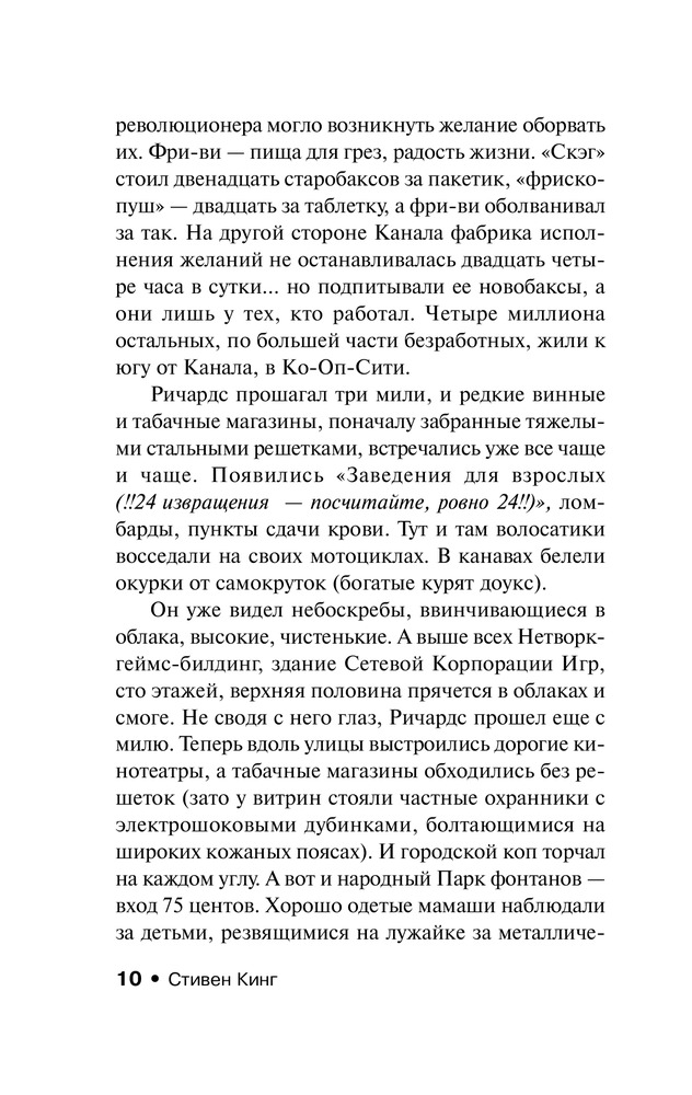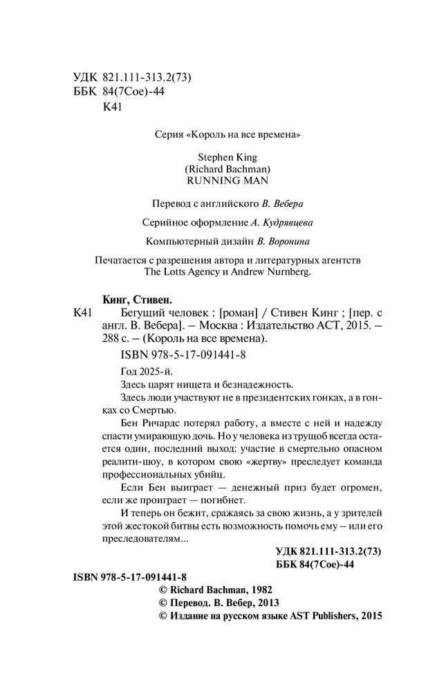Очень захватывающая книга. Читается легко. Прочал ее полностью за 2 дня. Динамично, энергично, интересно! Хотя это немного необычный для Кинга жанр, его привычнее считать Королем ужасов, от него ждешь чего-то вроде Сияния. А Бегущий человек скорее в стиле Бегущего в Лабиринте, Голодных игр, Дивергента. Но книга классная! Рекомендую!
