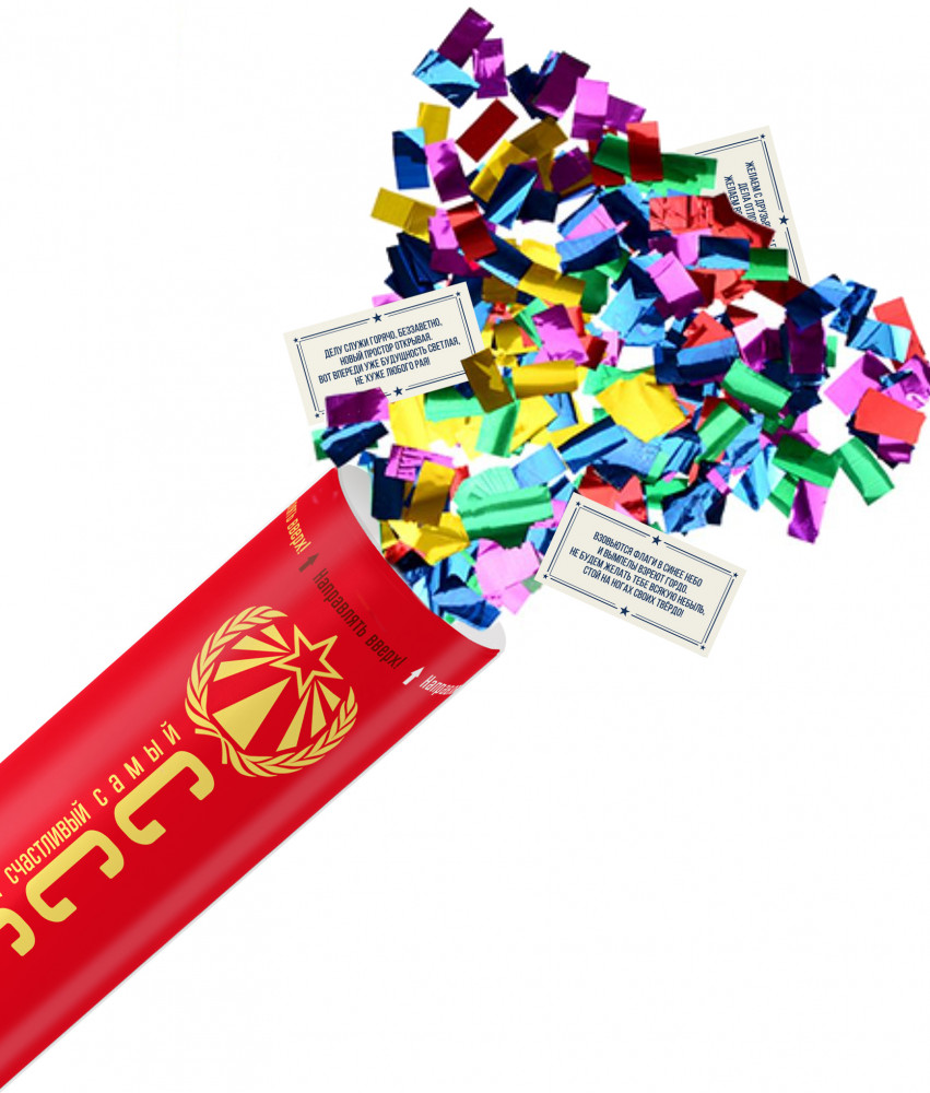 Праздничная пневмохлопушка с наполнителем из разноцветного конфетти создает неповторимую атмосферу праздника! Множество небольших ярких частичек эффектно разлетается в воздухе в самый неожиданный момент торжества, неся за собой шлейф смеха, радости и веселья! Они, словно радужное облако, окутывают всех присутствующих на празднике гостей! Среди конфетти можно также найти приятное пожелание на предстоящий год. |