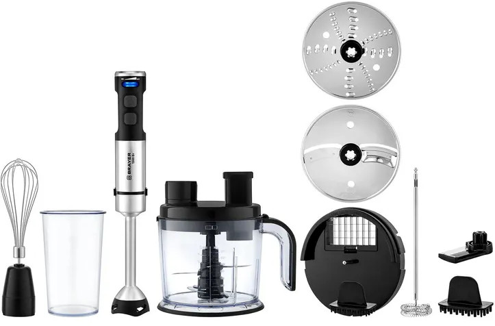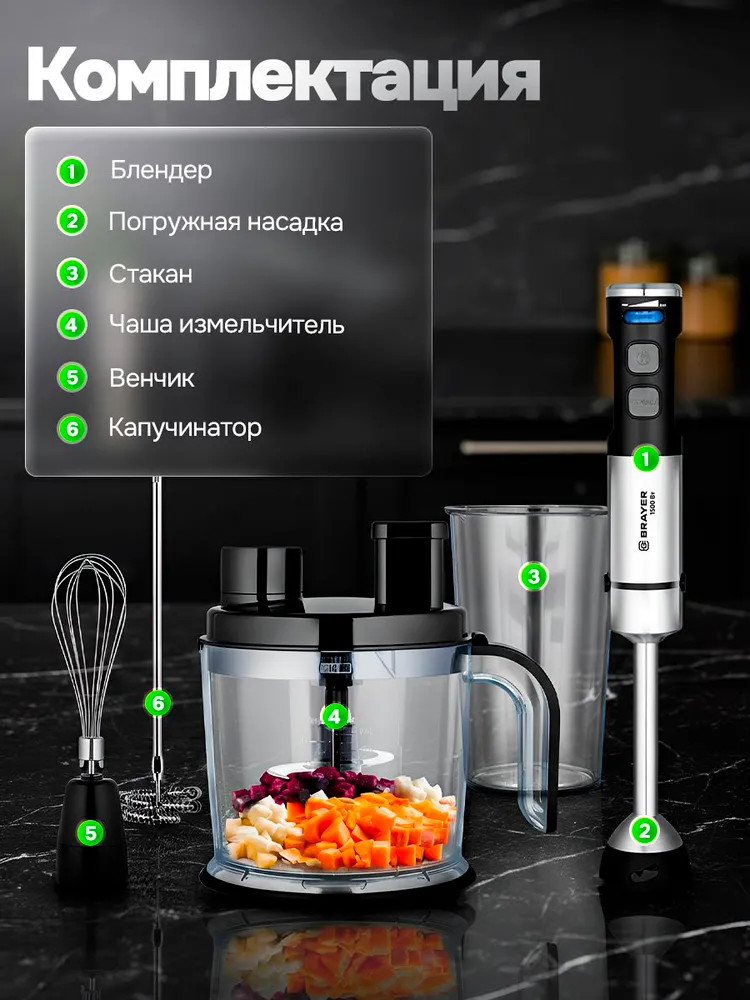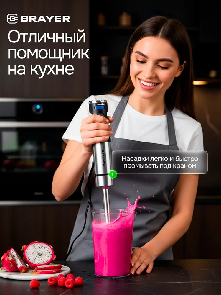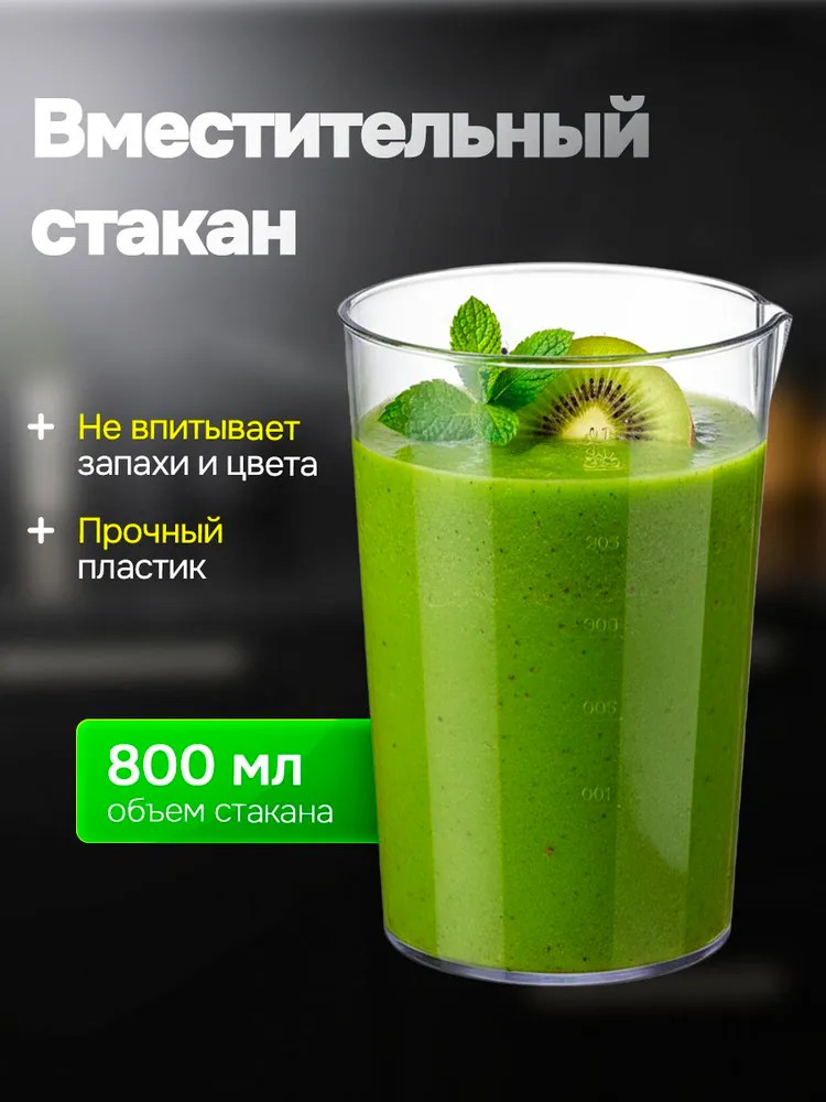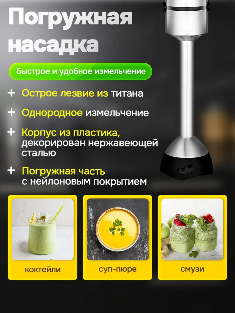 • эргономичный дизайн: Ручка блендера удобно ложится в руку, обеспечивая комфортное управление устройством во время работы.