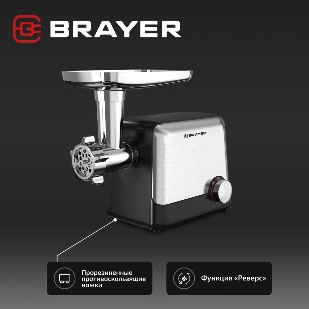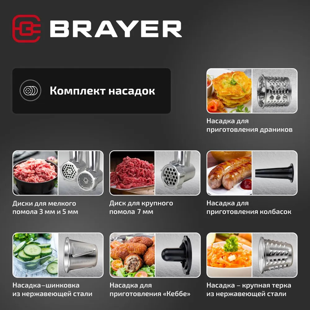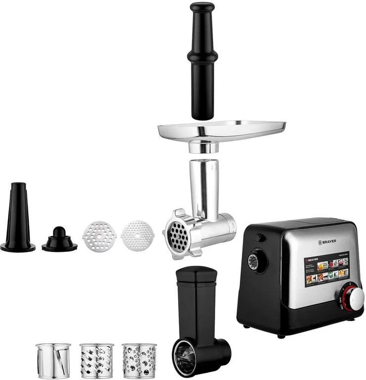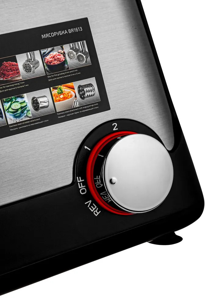Электромясорубка оснащена функцией «Реверс» для легкой очистки от застрявших волокон мяса, а защита от перегрева продлевает срок службы устройства. В комплект входят насадка для колбас, насадками «Кеббе», насадка для драников, а также диски для шинковки и терки. Это позволяет использовать прибор не только как мясорубку, но и для других видов приготовления продуктов. Лоток удобен для загрузки ингредиентов, а съемный толкатель упрощает процесс работы с крупными кусками. Питание устройства осуществляется от электросети с параметрами 220-240 В и частотой 50-60 Гц.