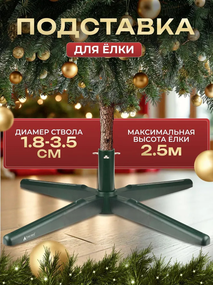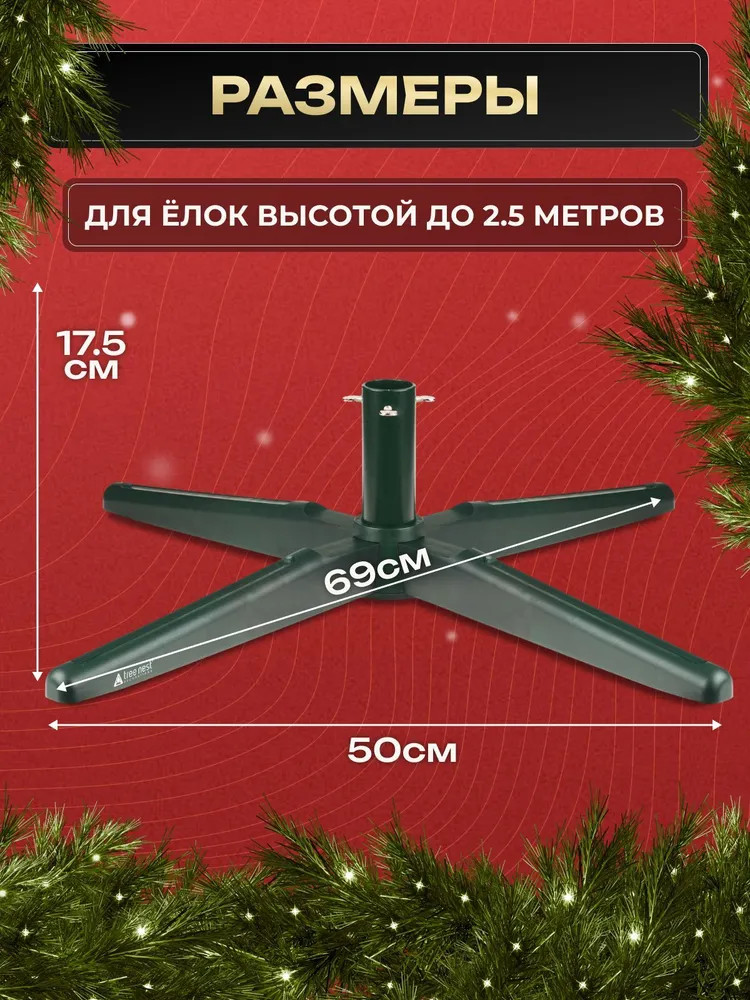 Подставка для ели отличается простым классическим дизайном, зеленым окрасом поверхности, гармонирующим с естественным цветом хвои, и устойчивыми опорами для деревца высотой до 2.5 метров. Это универсальная крестовина, подходящая как для искусственной, так и живой ели.