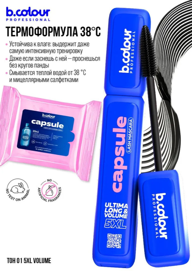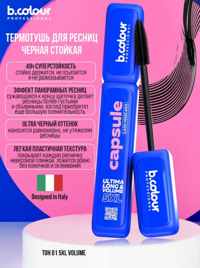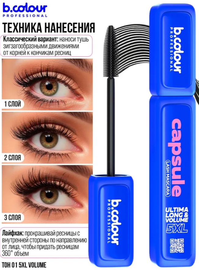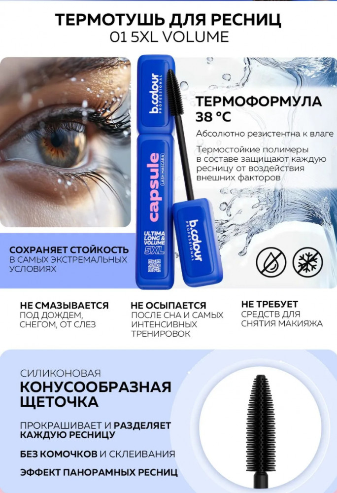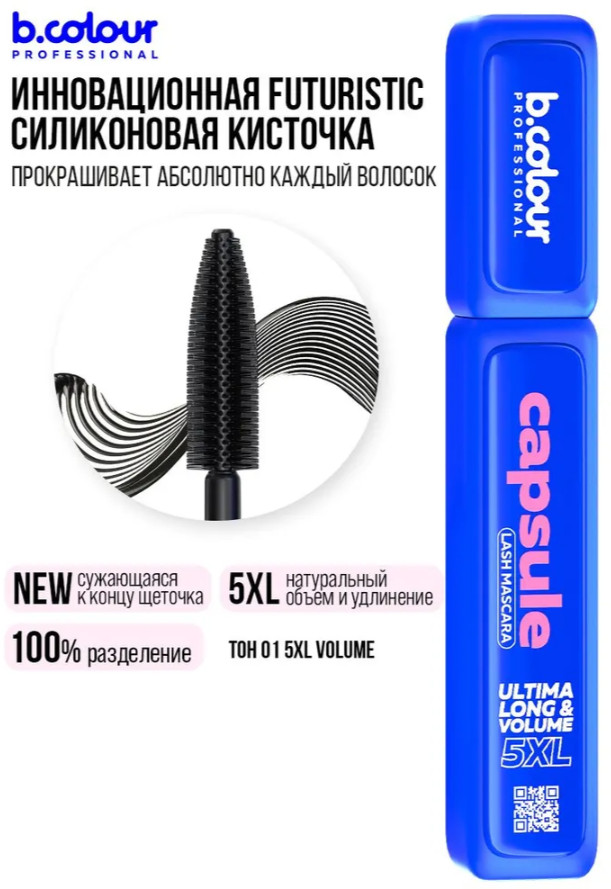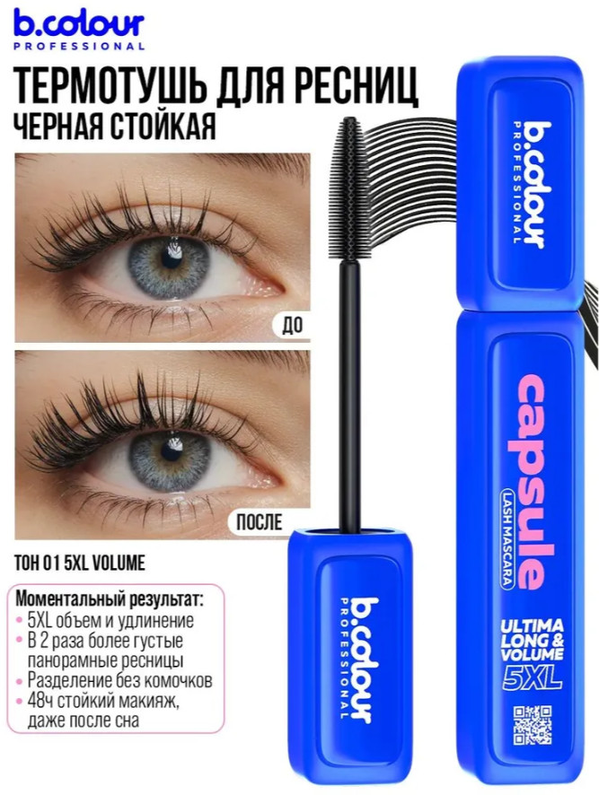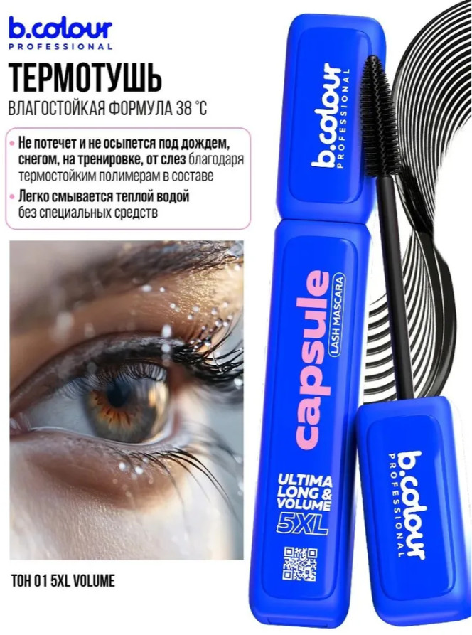 Тушь для ресниц, объем и удлинение B.COLOUR PROFESSIONAL CAPSULE 01 5XL Volume (6 мл). Термотушь для ресниц с Термоформулой 38 °С придает 5XL объем и удлиняет с эффектом панорамных ресниц, стойко держится весь день, не размазывается и не осыпается. Профессиональная термотушь, суперстойкая тушь для ресниц черная объем удлиняющая B.сolour Professional Thermo Tubing Mascara — сочетает стойкость, комфорт и лёгкое снятие. Термо тушь удлиняющая B.COLOUR PROFESSIONAL — классика роскошных ресниц.