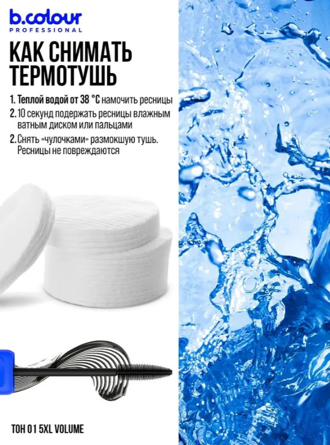 Как смывать термотушь: термостойкая тушь формула 38 °C смывается только теплой водой, без трения, без использования других средств демакияжа. Тушь без мицеллярки и смывается чулочками, трубочками, не размазывается. Смывается теплой водой, то есть средство для снятия макияжа вам не понадобится вообще. Размочите 20-30 секунд подушечками пальцев или спонжем теплой водой 38 °C, без трения, при снятии термо тушь для ресниц сходит как бы «чулочками» с каждой реснички, не оставляя темных кругов под глазами.