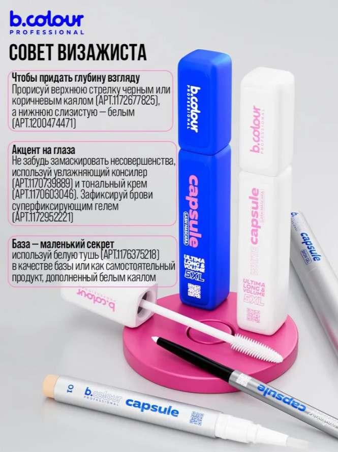Тушь capsule формирует на каждой реснице тонкое «чулочное» покрытие, обеспечивая эффект удлинения и объема без комочков и осыпания. Одним движением тушь для ресниц придаёт экстремальный 5XL объем и удлинение, в 2 раза более густые панорамные ресницы.