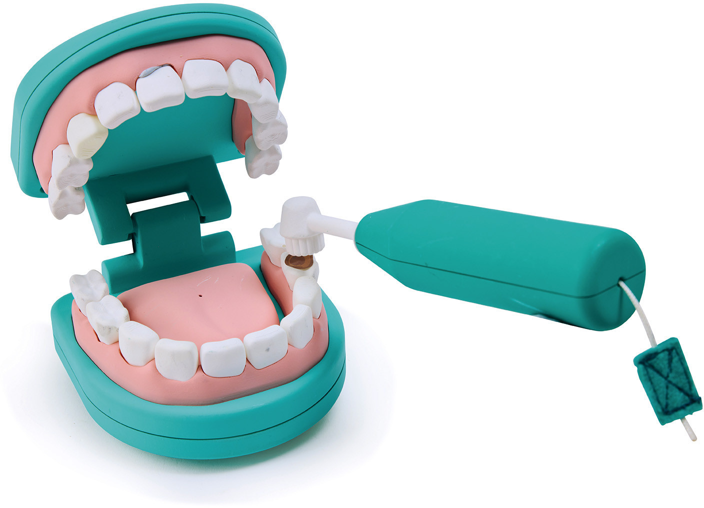 В комплекте: 4 интерактивных зуба, вибрирующая зубная щётка с тремя головками, тюбик зубной пасты, полировочный инструмент, зубная нить для очистки межзубных промежутков, зеркало, шприц, щипцы, верхняя и нижняя пластины для выравнивания зубов, образцы еды (кусочки сладкого), именной бейдж, двухсторонние учебные карточки, наклейка с изображением разрушения зуба, дополнительные съёмные зубы, мешочек для хранения зубов, стильная сумка для хранения всех элементов набора. |