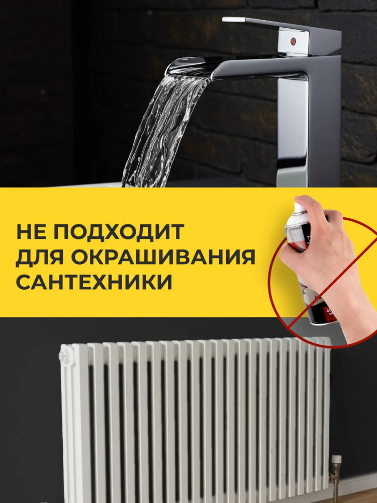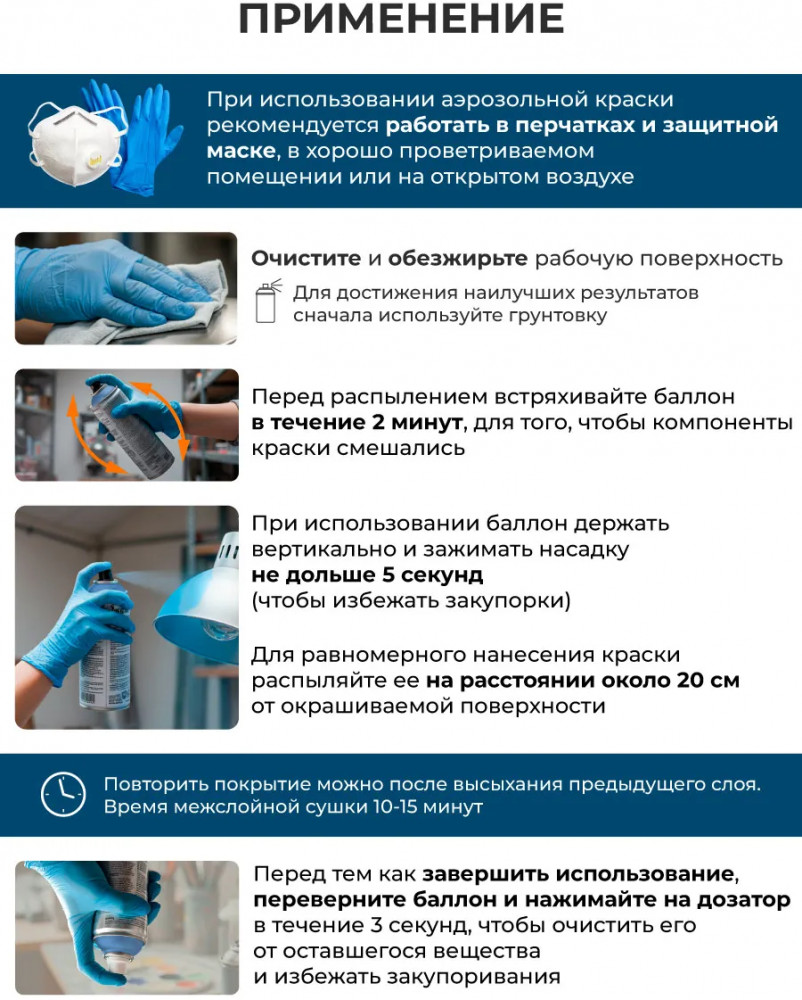 Применение: при использовании аэрозольной краски рекомендуется работать в перчатках и защитной маске, в хорошо проветриваемом помещении или на открытом воздухе. Очистите и обезжирьте рабочую поверхность от пыли, жира и других загрязнений. Для достижения наилучших результатов сначала используйте грунтовку. Перед распылением встряхивайте баллон в течение 2 минут для того, чтобы компоненты краски смешались. При использовании баллон держать вертикально и зажимать насадку не дольше 5 секунд (чтобы избежать закупорки). Для равномерного нанесения краски распыляйте ее на расстоянии около 20 см от окрашиваемой поверхности. Повторить покрытие при необходимости можно после высыхания предыдущего слоя. Время межслойной сушки 10-15 минут. Перед тем как завершить использование, переверните баллон и нажимайте на дозатор в течение 3 секунд, чтобы очистить его от оставшегося вещества и избежать закупоривания.