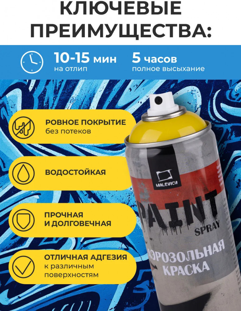 Аэрозольная акриловая краска Малевичъ. Универсальные акриловые краски в спрее — это высококачественная краска на органической основе. Отличается быстрым высыханием и высокой укрывистостью, идеально подходят для самых разнообразных проектов как в интерьере, так и на открытом воздухе. Благодаря тончайшему распределению частиц по поверхности она обеспечивает равномерное и плотное покрытие на любых материалах — от металла и ABS пластика до дерева. Её стойкость к ультрафиолетовому излучению и внешним воздействиям гарантирует долговечность и яркость цвета. Идеально подходящая для художественных и декоративных работ, эта аэрозольная краска Малевич позволяет создавать яркие и выразительные работы, обеспечивая высокое качество и надежность результата.