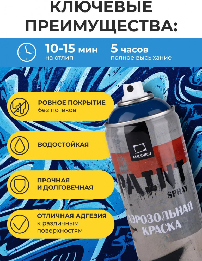 Аэрозольная акриловая краска Малевичъ. Универсальные акриловые краски в спрее — это высококачественная краска на органической основе. Отличается быстрым высыханием и высокой укрывистостью, идеально подходят для самых разнообразных проектов как в интерьере, так и на открытом воздухе. Благодаря тончайшему распределению частиц по поверхности она обеспечивает равномерное и плотное покрытие на любых материалах — от металла и ABS пластика до дерева. Её стойкость к ультрафиолетовому излучению и внешним воздействиям гарантирует долговечность и яркость цвета. Идеально подходящая для художественных и декоративных работ, эта аэрозольная краска Малевич позволяет создавать яркие и выразительные работы, обеспечивая высокое качество и надежность результата.