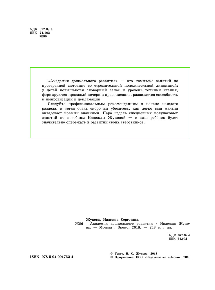 В данный момент этот товар отсутствует в продаже. Возможно, у нас найдется аналогичный или похожий товар здесь. Серия: Надежда Жукова «Академия дошкольного развития» — это комплекс занятий по проверенной методике со стремительной положительной динамикой: у детей повышаются словарный запас и уровень техники чтения, формируются красивый почерк и правописание, развивается способность к импровизации и декламации.