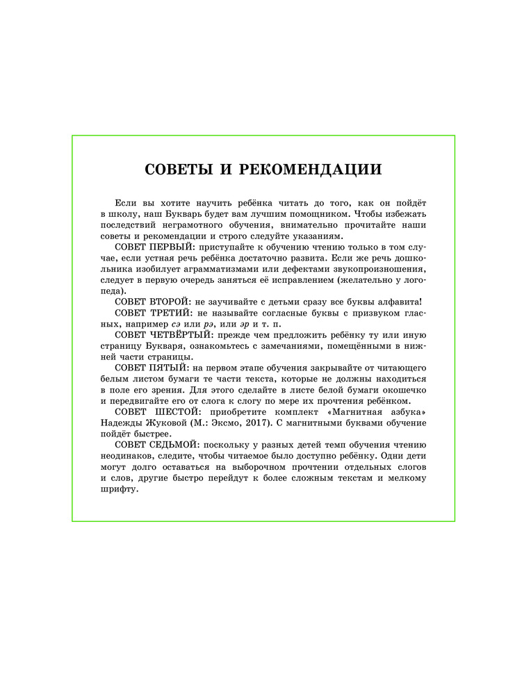 Следуйте профессиональным рекомендациям в начале каждого раздела, и тогда очень скоро вы убедитесь, как легко ваш малыш овладевает новыми знаниями. Пара недель ежедневных получасовых занятий по пособиям Надежды Жуковой — и ваш ребёнок будет значительно опережать в развитии своих сверстников.