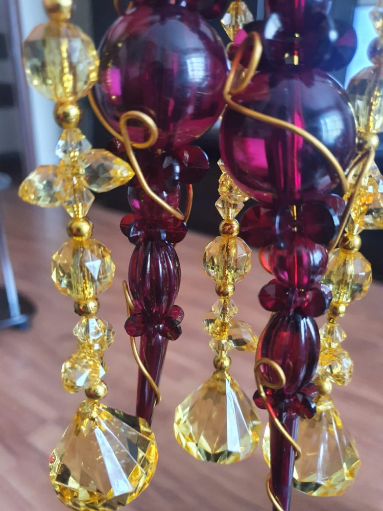 Довольно неплохие ёлочные украшения. Соответствует описание. На мой вкус - очень красивая форма сосулек. Когда я их покупала, думала, что эти сосульки цвета бордо. На самом деле это темно - малиновый цвет. Пришли немного кривоватые. Но, выпрямить можно. Внутри сосулек имеется металлический стержень, поэтому детали располагаются неподвижно по отношению друг к другу. Я брала 2 комплекта подвесок. По сравнению с жёлтыми подвесками эти малиновые, конечно, не такие прозрачные, не такие сверкающие. Пластик мутный. Основная деталь в виде шара имеет какие-то шероховатости, мелкие царапины. Мне нужна была в данном случае именно такая форма украшений + довольно невысокая цена. Поэтому на эти недостатки не обратила особого внимания.