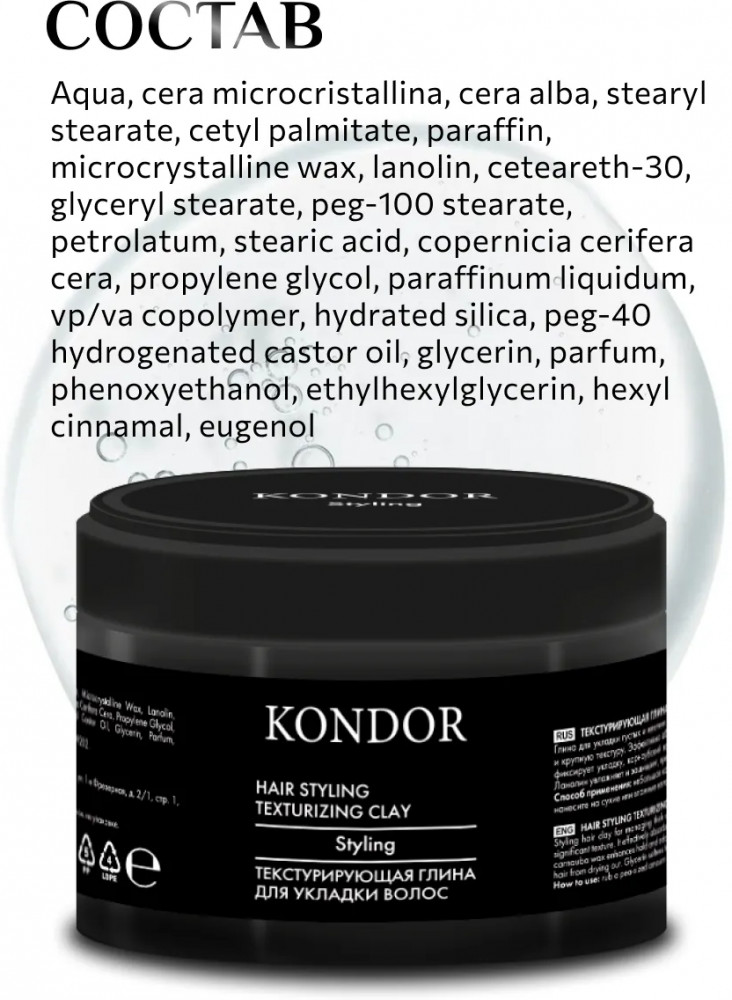Серия: Styling Глина для укладки густых и жестких волос без эффекта утяжеления. Средство обеспечивает супер сильную фиксацию на целый день и крупную текстуру. Эффективно абсорбирует излишки себума, надолго поддерживая чистоту и свежесть. Пчелиный воск в составе фиксирует укладку, карнаубский воск — усиливает фиксацию и добавляет яркой текстуры, что особенно важно для густых волос. Ланолин увлажняет и защищает, предотвращая пересыхание. Глицерин смягчает и добавляет послушность. Легко смывается водой. |