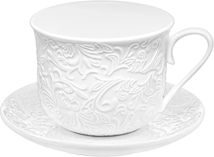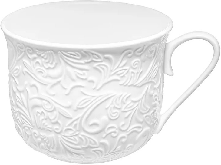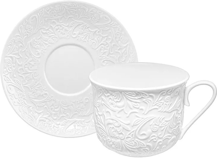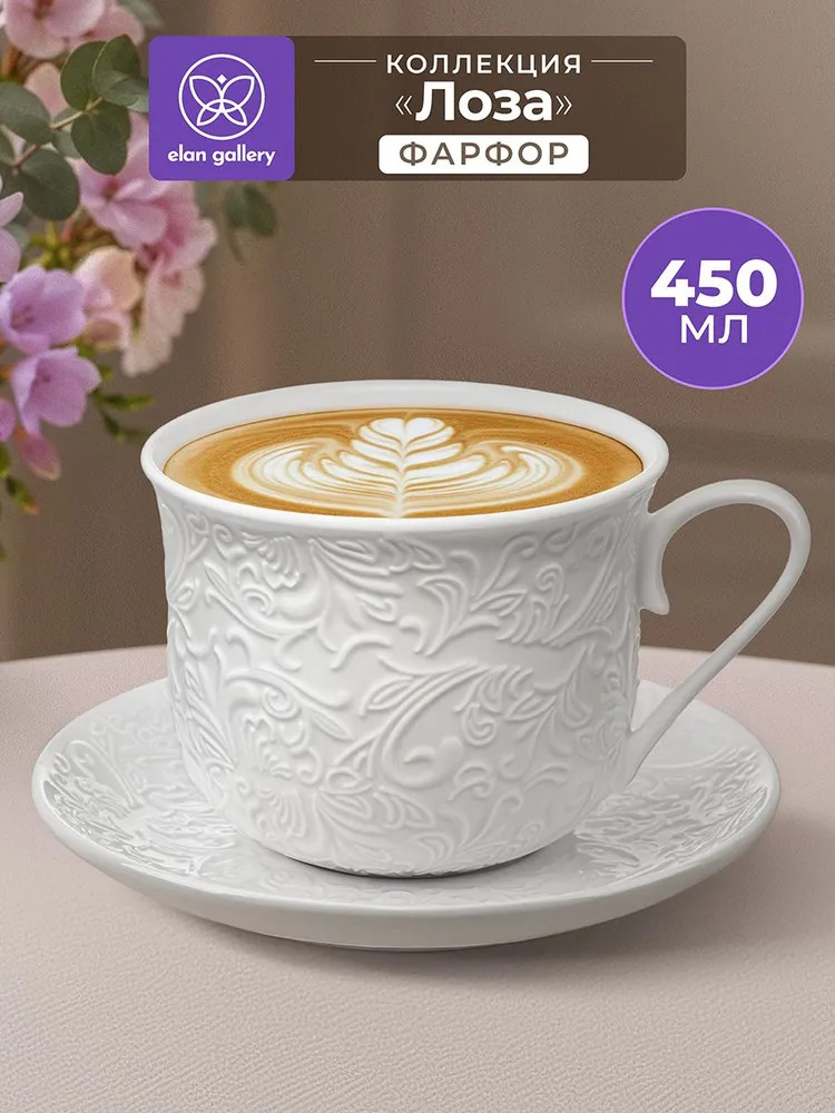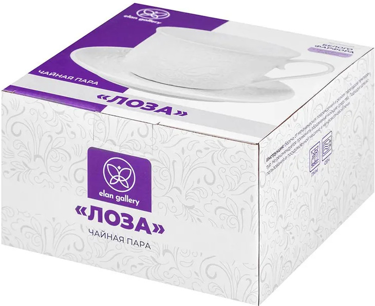 Чайная пара Elan Gallery «Лоза» выполнена из белого фарфора, украшена изящным рельефным узором. Объём чашки — 450 мл, размер — 14×11×8.5 см. Размер блюдца — 16×16×2 см. Кружка и десертное блюдечко подходят любителям уютных чаепитий, а также ценителям чая и кофе. Посуда украсит ваш стол своим стильным дизайном как на праздник, так и в будни. Это идеальный вариант для того, чтобы согреться горячим напитком зимой и освежиться прохладным лимонадом летом.